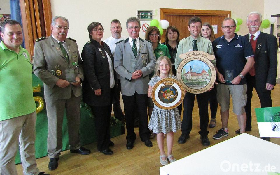 Bei der Siegerehrung des Jubiläumsschießens der Speckbachpelzer: Schützenmeister Josef Diertl (links), Gauschützenmeisterin Rebecca Kramer (Dritte von links), die beste Einzelschützin Michaela Forsmann (Sechste von links), die Gewinnerin der Bogen-Eröffnungsscheibe, Magdalena Kroher (Siebte von links), Jens Wittmann (Neunter von links) mit der Patenvereinsscheibe, und der Präsident des Oberpfälzer Schützenbunds, Franz Brunner (rechts).