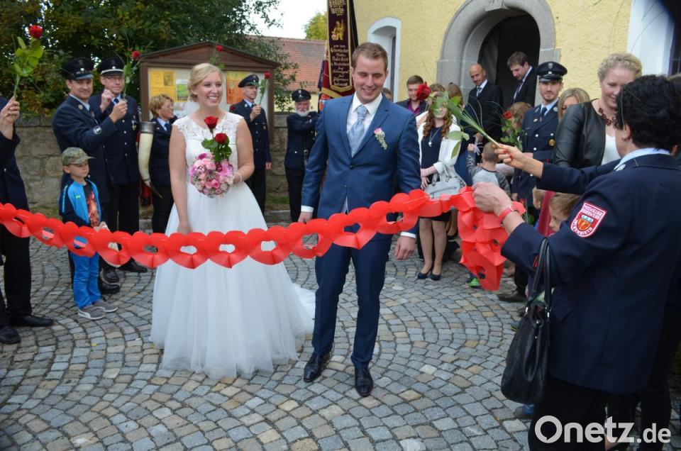 Simon ist Aktiver und dazu Atemschutzträger bei der Feuerwehr Irchenrieth, für die die beiden Vorsitzenden Reinhard Ach und Helmut Ermer die Glückwünsche übermittelten. Dass man die Neu-Irchenrietherin bei den Feuerwehrfrauen mit offenen Armen aufnimmt, das machte Christa Kick mit vielen roten Herzchen an einer Schnur aufgereiht deutlich, die die beiden dann überschritten. Dass Beate natürlich für den Feuerwehrdienst in Irchenrieth alle Voraussetzungen mitbringt, machten die Wehrkameraden Großenschwand um Vorsitzenden Karl Kraus und Kommandanten Hans Götz deutlich. Schließlich hat sie schon fast alle Leistungsprüfungen absolviert und ist zudem Mitglied in der Vorstandschaft. Aber mit der Hochzeit gibt es auch einen Wehrmutstropfen.