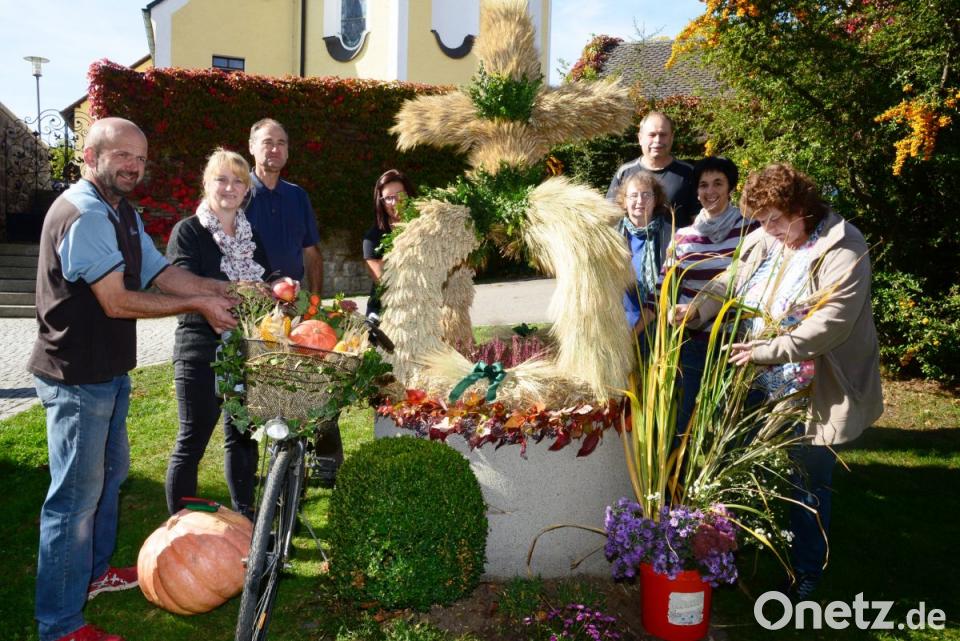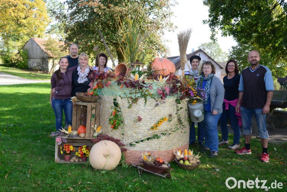 Doch um das möglich zu machen, waren mit dem Binden der Erntekrone, ja selbst mit dem Beschaffen von Blumen entsprechende Vorbereitungen notwendig. Am Samstagnachmittag setzten Dorfgemeinschaftsvorsitzende Lydia Windirsch mit ihren Helfern dem Brunnen beim Kriegerdenkmal die Erntekrone auf, unmittelbar daneben steht ein altes Fahrrad, „blumig“ geschmückt und mit einem riesigen Kürbis nicht zu übersehen. Am Dorfweiher haben die Helfer einer Rolle aus Stroh mit Blumen, Obstkörben, leuchtend gelben Maiskolben und Kartoffeln im Kübel und gebundenen Ähren ein prächtiges Aussehen gegeben.
