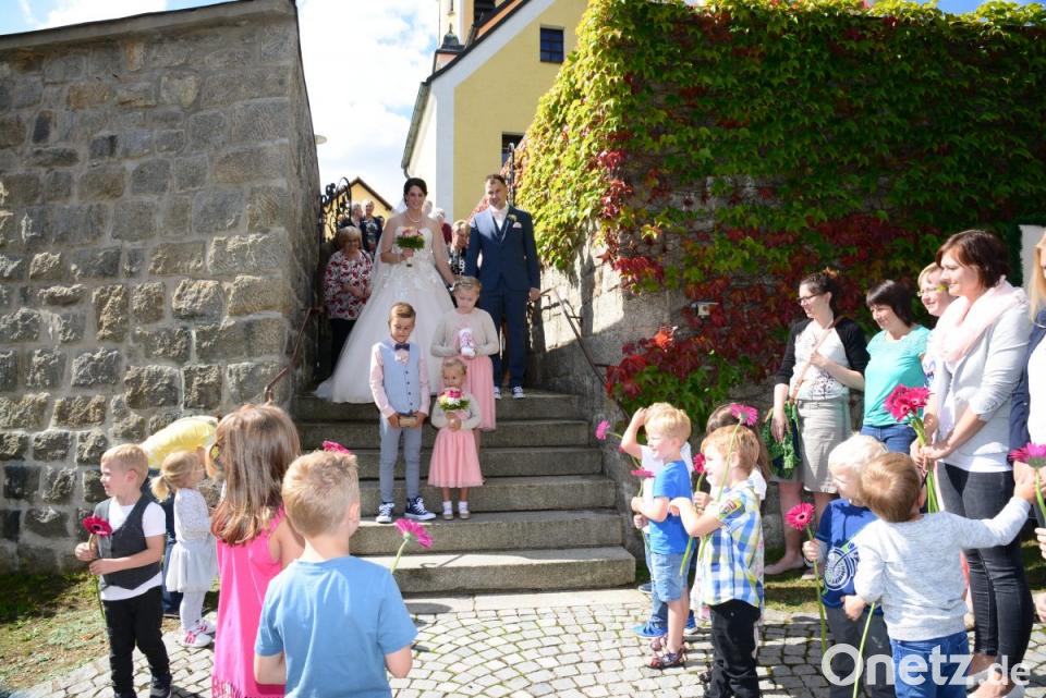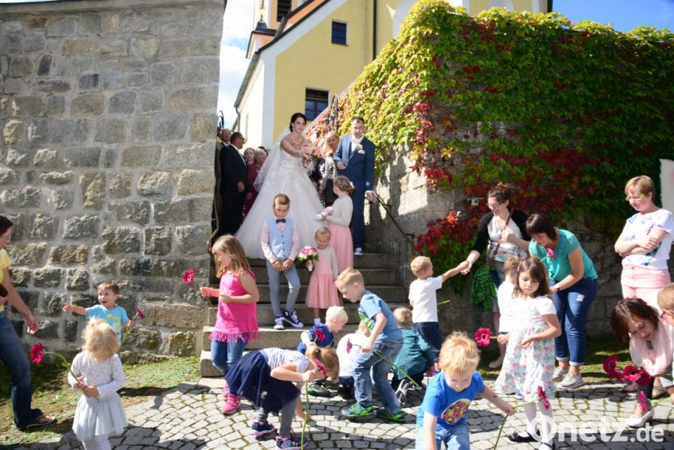 Der 34-jährige Zerspanungsmechaniker und die 28-jährige Heilerziehungspflegerin hatten sich im Februar 2016 in einem Café in Marktredwitz kennengelernt und waren im Juni 2017 sicher für immer zusammenbleiben zu wollen. Als Wohnort hat sich das frisch getraute Paar den Pleysteiner Ortsteil Miesbrunn ausgewählt. Nach der Trauungszeremonie standen Mitglieder des Schützenvereins Concordia Konnersreuth mit 1. Schützenmeister Max Bindl, zugleich auch Erster Bürgermeister des Marktes Konnersreuth an der Spitze Spalier und ließen das Brautpaar durch einen Bogen aus Rosen gehen. Rote Gerbera überbrachten die Kindergartenkinder des Kindergartens St. Emmeram Waidhaus gemeinsam mit ihren Müttern. Die Glückwünsche der Kinder kamen gemeinsam per Gedicht. Nach den vielen Gratulationen durfte das Brautpaar mit dem Pfeil aus dem Blasrohr rote Ballonherzen zum Platzen bringen. Dann ging es für die Hochzeitsgesellschaft in die „Drei Lilien“ nach Vohenstrauß.