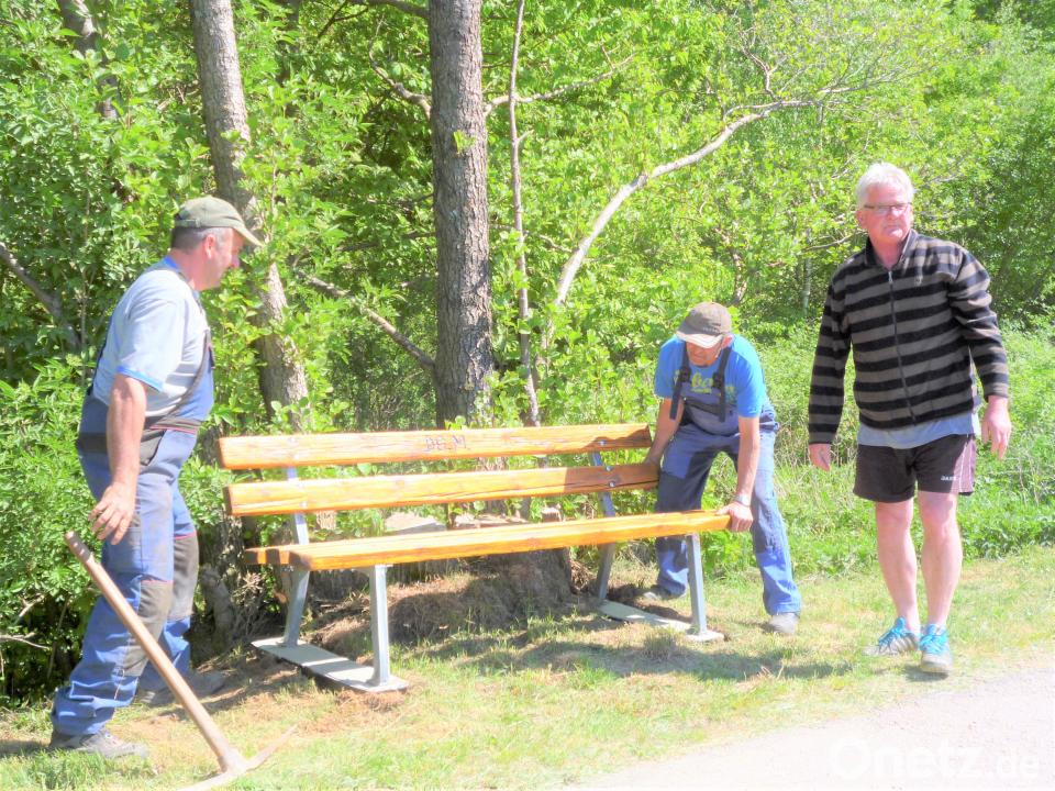 (tu) Christian Gatzky nahm sich der Sache an. Er hobelte, schleifte und lasierte in seiner Freizeit stundenlang und kostenlos die Spinte der Bänke, und das Ergebnis seiner Bemühungen konnte sich wahrlich sehen lassen. Die Sitzgelegenheiten präsentierten sich wieder wie neu. Nach getaner Arbeit stellten einige Dorfleute die sanierten Bänke im Bereich Fuchsenberg auf und betonierten sie fest in den Boden ein. Spaziergänger nehmen sie seitdem wieder sehr gut an.