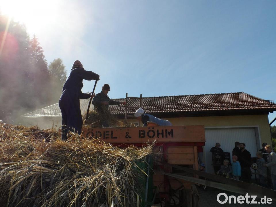 Am Nachmittag konnte dann der 15-PS-Deutz-Schlepper aus dem Jahr 1950 zeigen, was noch in ihm steckt. Mit einem langen Treibriemen auf der frei laufenden Riemenscheibe, der tüchtig mit "Remmer-Pech" eingeschmiert wurde, kam der alte Dreschkasten auf Höchstdrehzahl. Eine staubige Angelegenheit für die fünfköpfige Bedienmannschaft und die Zuschauer, die sich zwischenzeitlich eingefunden hatten.