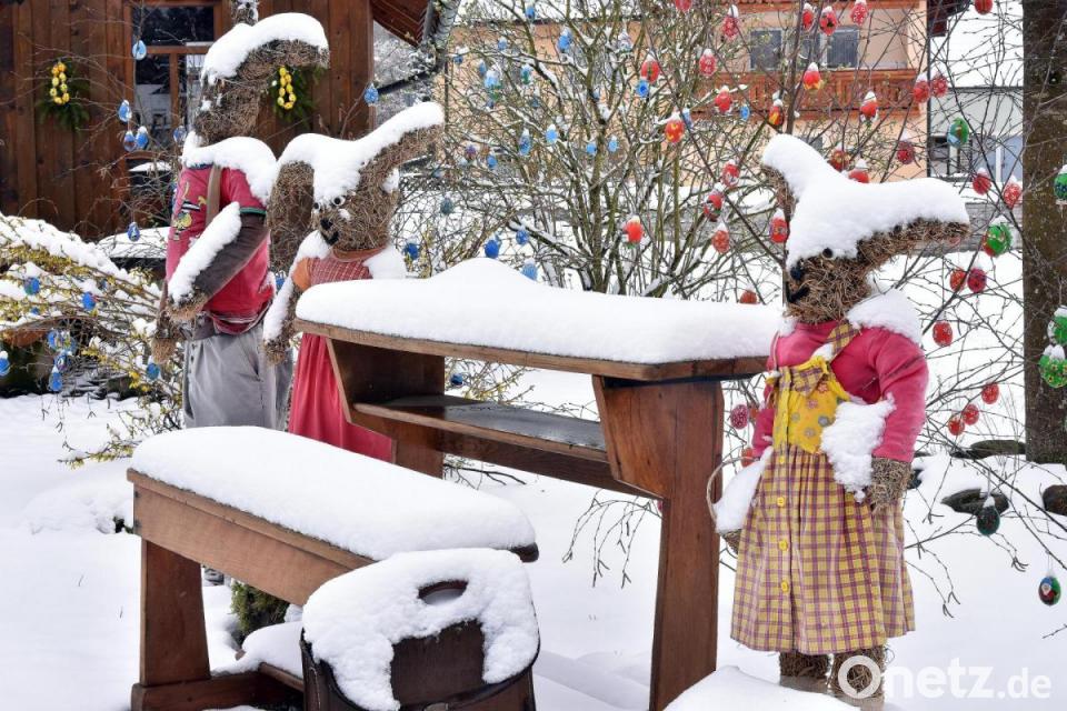 Ganz überraschend kam er nicht zurück, der Winter – die Schneefälle waren ja vorhergesagt. Ein wenig seltsam mutete die weiße Pracht am Wochenende dann aber trotzdem an. Insbesondere auf dem Dorfplatz in Mittelreinbach (Neukirchen/Landkreis Amberg-Sulzbach), wo der Schnee der frühlingshaft-österlichen Dekoration am Sonntag ein weißes Häubchen aufsetzte.