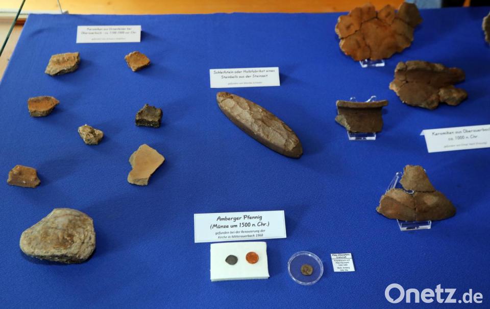 Im humosen Boden kommt eine Ofenkachel von respektabler Größe ans Tageslicht, die im 15. Jahrhundert hergestellt wurde. "Wir haben nicht gedacht, dass der Hof so alt ist", sagen Maritta und Laurenz Lorenz. Die Zeitspanne von 1100 vor bis 1500 nach Christus ist gefüllt mit weiteren, ausgewählten Funden, darunter ein Amberger Pfennig. Dieser wird allerdings bei der Kirchensanierung 1968 entdeckt. Schwarz weist auf den Löwen auf der einen und das Signet der Amberger Münzstätte auf der anderen Seite hin. Weitere Funde liegen noch in Kisten in der Dachkammer neben dem Museumsraum.