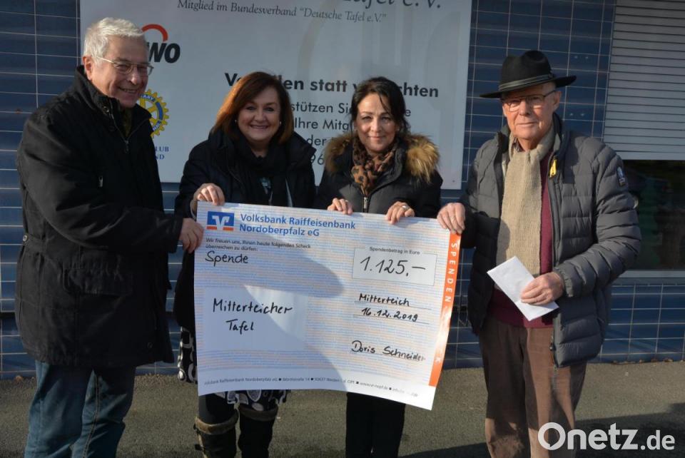 Bei der psychologischen Beraterin und Fußreflexzonen-Masseurin durfte Menschen sich die Füße massieren lassen, worauf sich die Teilnehmer der Aktion mit einer Spende bedankten. Auf diese Weise kamen 1125 Euro zusammen, die Doris Schneider jetzt der Mitterteicher Tafel zur Verfügung stellte. Bei der symbolischen Scheckübergabe mit dabei waren die Vorstandsmitglieder Gerhardt Höhn und Karl Haberkorn.