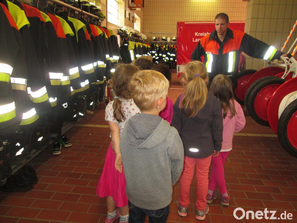 (exb) In vier Gruppen unterteilt durften die Mädchen und Buben einiges ausprobieren. Viele erfahrene Rettungskräfte wie Otto Weiß und die Jugendfeuerwehr vermittelten Wissenswertes über Rettungsspreizer und -schere, ein Feuerwehrauto, verschiedene Schutzanzüge und das Funken. Höhepunkte des Nachmittags waren das Löschen eines „Brandes“ in einem Häuschen und das Fahren mit der Drehleiter, in bis zu 30 Meter Höhe. Die Kinder bestaunten die Stadt und die umliegenden Dörfer von oben. Als Erinnerung erhielten die Mädchen und Buben kleine Feuerwehrautos. Mit Sirene und Blaulicht ging es anschließend über Umwege zurück zum Kindergarten.