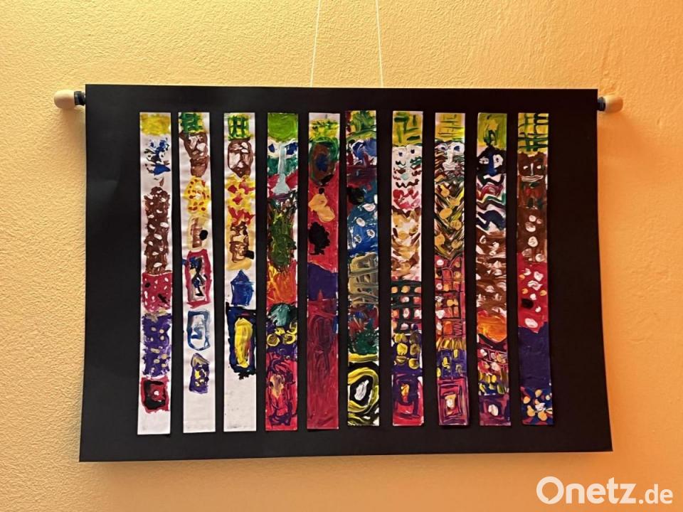 Nachdem die Kinder mehrere Streifen farbig gestaltet hatten, zeigte Sticht ein Bild von Friedensreich Hundertwasser. Dieses sollte auf einem dünneren Streifen nachgemalt werden. In kleineren Schritten – Hut, Gesicht, Körper, Haus, Spirale – wurden die einzelnen Bildteile untereinander gemalt. Dies war eine besondere Herausforderung für die Kinder, da ein Bild zwar nachgemalt wurde, aber ganz anders aussah. Die Kinder wurden mit einem Blick auf die kommenden Tage verabschiedet: Sie erfuhren, dass aus ihren gemalten und dann getrockneten Streifen ein gemeinsames Kunstwerk je Gruppe entstehen sollte. "Den Kindern hat dieser ,Ausflug‘ in die Kunst sehr gefallen", heißt es in der Mitteilung. "Vermutlich suchen sie jetzt auf Bildern, an denen sie zufällig vorbei kommen, eine kleine Libelle."