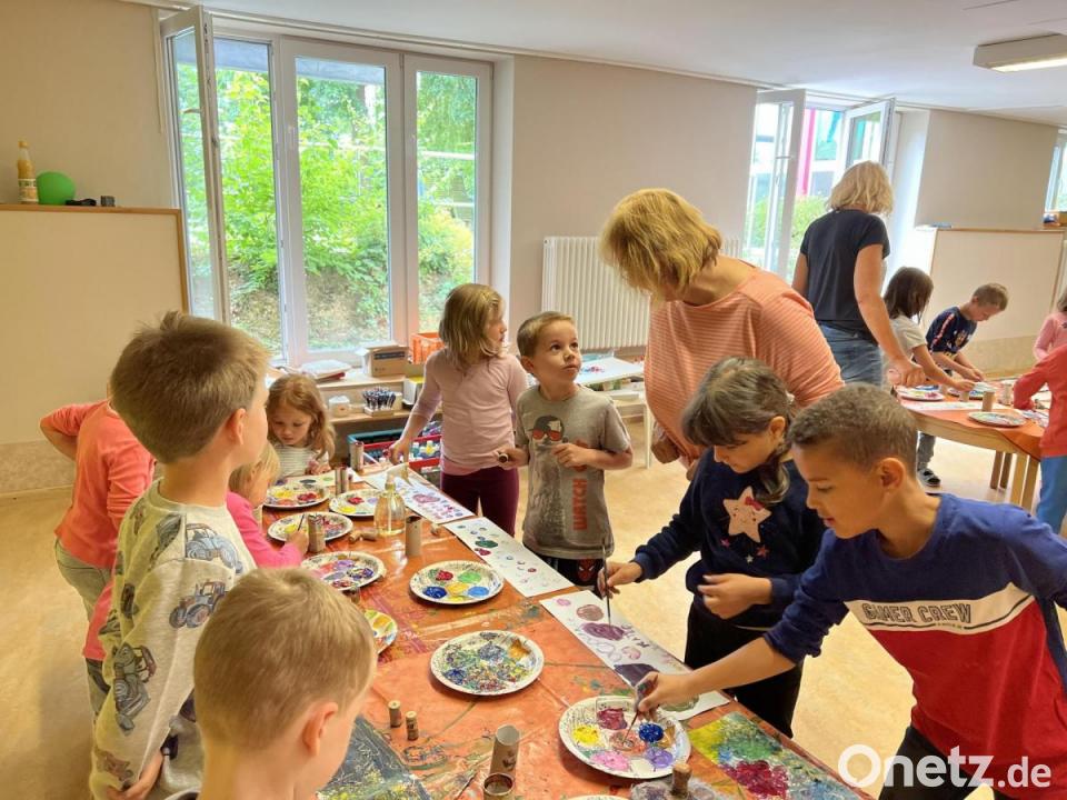 Im Anschluss daran verteilten sich die 21 Kinder an den Tischen. Die Mädchen und Buben bekamen einen Streifen Papier, Korken, einen Pappteller mit verschiedenen Farben und Klorollen – und los ging es. "Die Kinder bedruckten nach Anleitung mit den Korken die verschiedenen Farben auf die Streifen und Frau Sticht malte jedem, der wollten, eine Libelle – ihr Markenzeichen – in die frische Farbe."