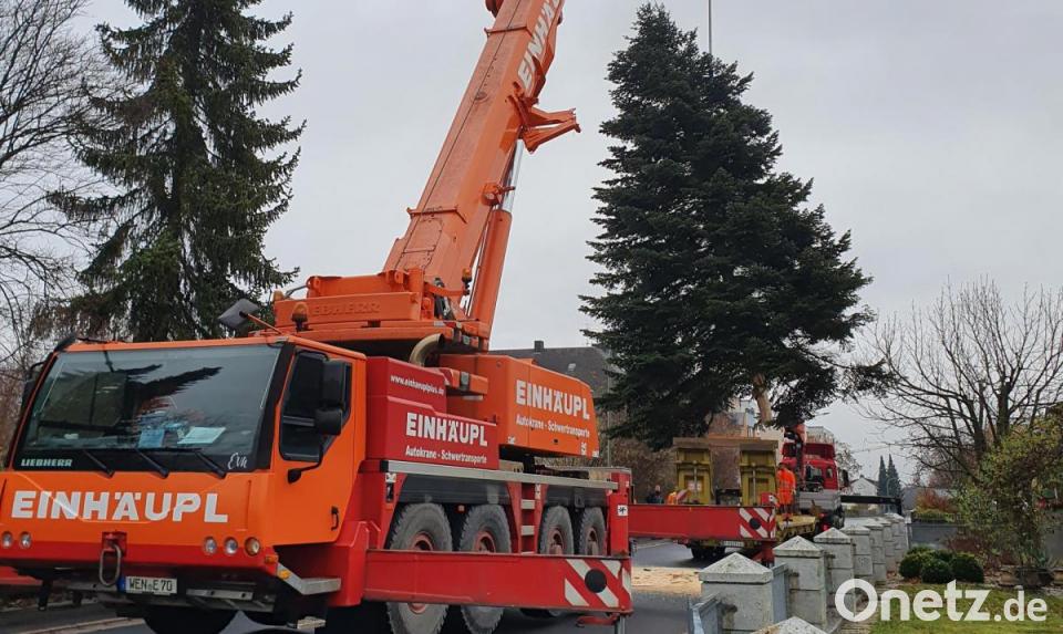 Eine Aktion mit schwerem Gerät sorgte am Montagmorgen für Aufsehen im Mitterteicher Stadtgebiet: Mit Unterstützung einer Spezialfirma wurde der diesjährige Weihnachtsbaum der Stadt von der Kohllohstraße zum Kirchplatz gebracht. Es handelt sich um eine stattliche Tanne, die Anton Krämer zur Verfügung gestellt hat. Mit einer Höhe von 12,5 Metern und einem Gewicht von drei Tonnen ist der Baum größer und schwerer als das Exemplar im Vorjahr, wie Bauhofleiter Wolfgang Stark mitteilte.