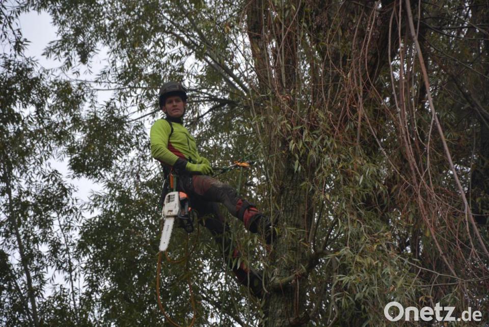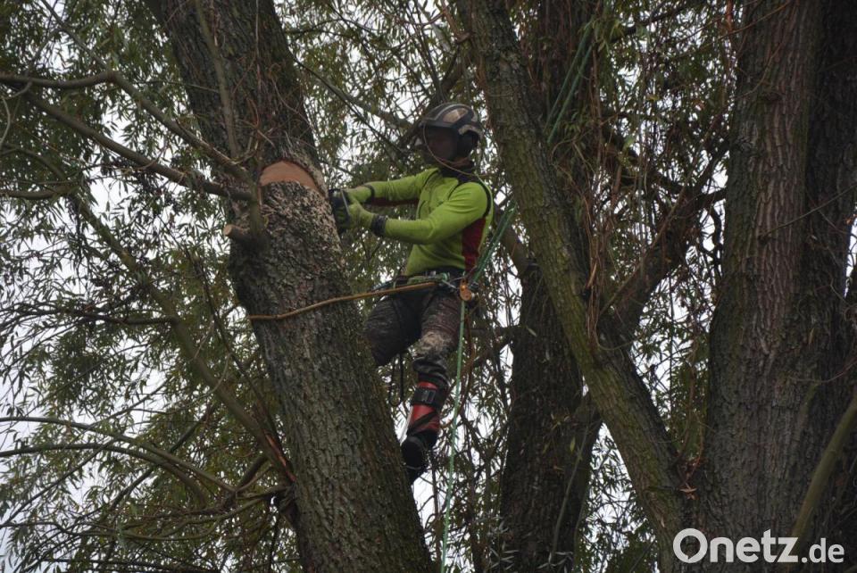 Manfred Härtl kletterte jeweils auf die Bäume, nahm Sägearbeiten vor und befestigte Seile und Haken für den Abtransport größerer Teile mit Hilfe eines Autokrans. Stück für Stück wurden die Bäume dadurch abgetragen. Ein Problem war laut Härtl der starke Befall der Bäume durch den Weidenbohrer. Diese bis zu zehn Zentimeter lange Raupe frisst Tunnel mit einer Breite von bis zu zwei Zentimetern ins Holz. Diese Schädigungen galt es bei der Bearbeitung der Stämme und Äste für das Wegheben zu beachten. Erschwert wurden die Baumfällungen zudem durch den vorbeiführenden Seibertsbach. Durch eine koordinierte Teamarbeit ging die Aktion aber reibungslos und unfallfrei über die Bühne. Manfred Härtl betonte, dass bei derartigen Maßnahmen Professionalität und Erfahrung gefragt seien. Abschließend wurden die gefällten Bäume noch an Ort und Stelle gehäckselt.