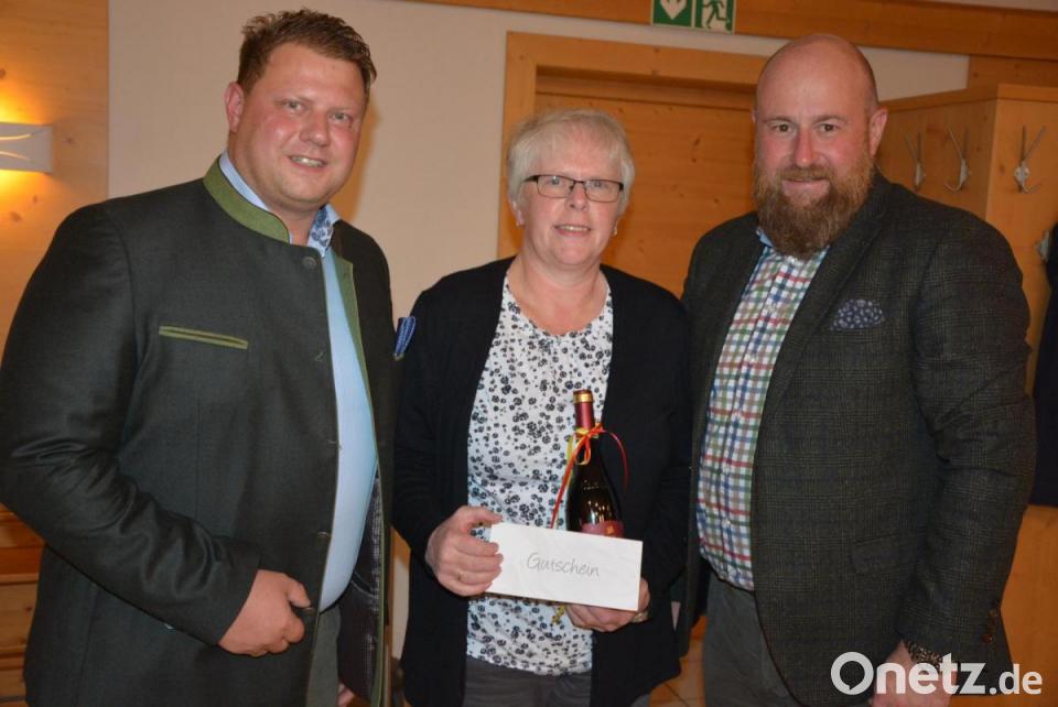 Mit einer Flasche Wein und einem Gutschein bedankten sich Vorsitzender Stefan Grillmeier und Stellvertreter Holger Paschedag bei Sigrid Haberkorn. Sie schied nach 21 Jahren als Schriftführerin auf eigenen Wunsch aus dem Vorstand aus.