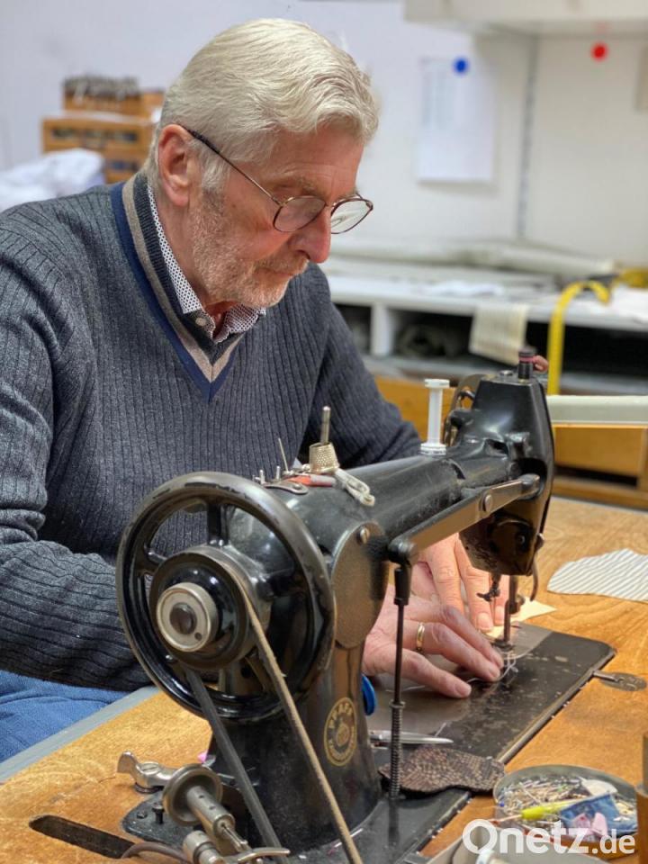Ernst Zeitler, Seniorchef des gleichnamigen Modehauses in Mitterteich, näht an seiner althergebrachten Nähmaschine Atemschutzmasken für den Hausgebrauch.