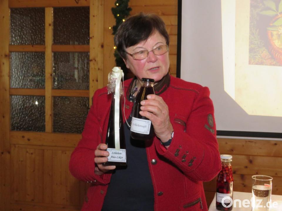 Weil's manchmal modern sein müsse, habe sie auch eine Kräuter-Pizza im Rezeptbuch, so die Referentin. Schnell und einfach sei das Kochen mit Kräutern, sagte Guthjahr weiter und demonstrierte dies anhand einiger Beispiele. So werde einfaches Speiseöl zum feinen Gewürz, wenn man diesem Kräuterzweige zufüge. Was die Anwesenden freute: Kräuter können problemlos eingefroren werden. "Wissenschaftler haben nachgewiesen, dass sie 4 Monate lang 97 Prozent der Vitamine behalten", wusste Guthjahr. Und sie erzählte, dass in der Brennnessel das Zehnfache an Vitamine C einer Orange schlummere. Und was tun gegen das Stechen? "Mit dem Nudelholz darüber rollen", hatte die Referentin auch hierfür einen Tipp. Zum Thema Wildfrüchte betonte sie, dass der schwarze Holunder in jeden Garten gehöre. Aber man dürfe ihn niemals mehr ausreißen: "Dann gehen alle guten Geister weg", wussten die Landfrauen eine alte Legende. Wer jetzt noch Schlehen im Garten habe, sollte sie ruhig sammeln und Likör machen, riet Guthjahr. Nach dem Frost seien diese besonders süß.
