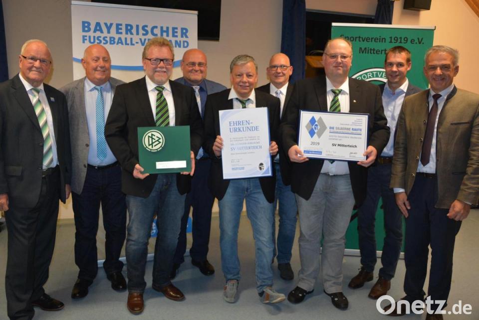 Im Namen des Bayerischen Landessportverbandes (BLSV) gratulierte Kreisvorsitzender Andreas Malzer mit einer Ehrenurkunde. Er dankte dem Verein für die herausragende sportliche und gesellschaftliche Arbeit. Eine gute Führungsmannschaft sei der Schlüssel zum Erfolg, so Malzer. Siegfried Tabbert, Kreisvorsitzender des Bayerischen Fußballverbandes (BFV), erinnerte an die Pioniere in der Gründungs- und Aufbauphase des SV Mitterteich. Sein Dank galt den Verantwortlichen heute und in der Vergangenheit. Ohne sie würde der Verein nicht schon seit Jahrzehnten zu den besten Mannschaften im Spielbezirk Oberfranken gehören. Tabbert würdigte zugleich das Ehrenamt und die rührige Arbeit der Verantwortlichen. "Heute ist für den SV Mitterteich ein guter Tag", sagte er abschließend und übergab stellvertretend für den Deutschen und den Bayerischen Fußballverband eine Plakette und eine Urkunde.