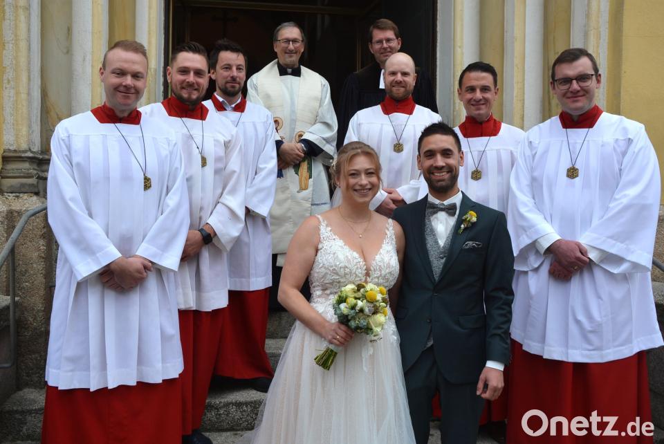 Die kirchliche Trauung leiteten Pfarrvikar Christian Preitschaft aus Gebenbach, sowie sein evangelische Kollege Andreas Kraft aus Mitterteich. Der Bräutigam war unter dem früheren Kaplan Christian Preitschaft, als dieser in Mitterteich wirkte, Ministrant. Blickfang waren die sechs Ministranten der Trauung, allesamt ehemalige Minis und Freunde des Brautpaares. Musikalisch wurde die gut einstündige kirchliche Feier vom Chor „Grazie A Dio“, Leitung Michaela Burger, aus Leonberg, umrahmt. Für Gänsehautmomente sorgte die Gesangseinlage von zwei Cousinen der Braut.