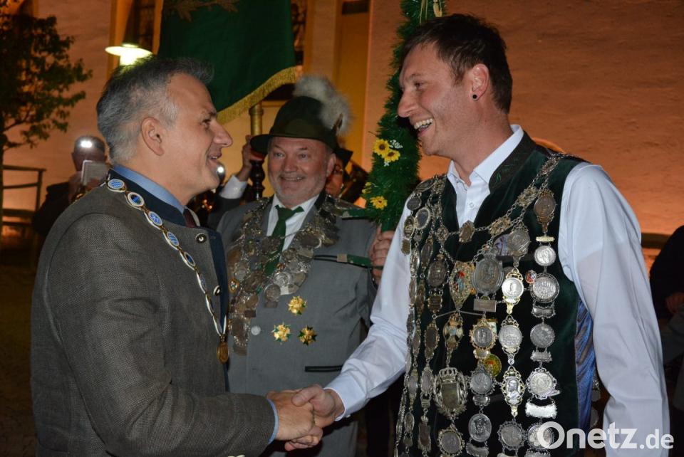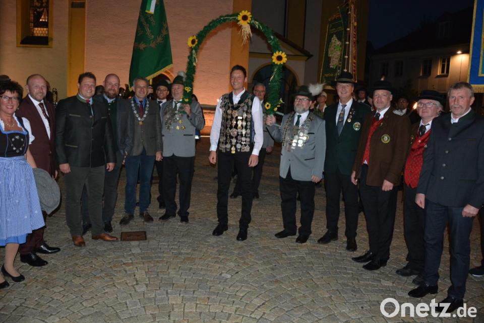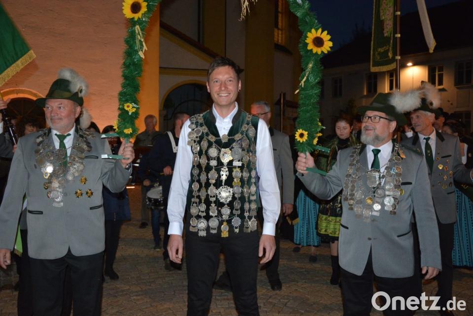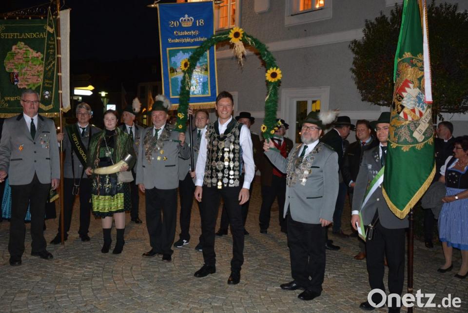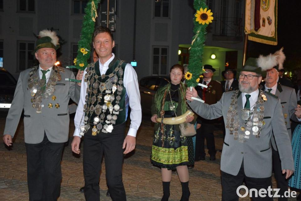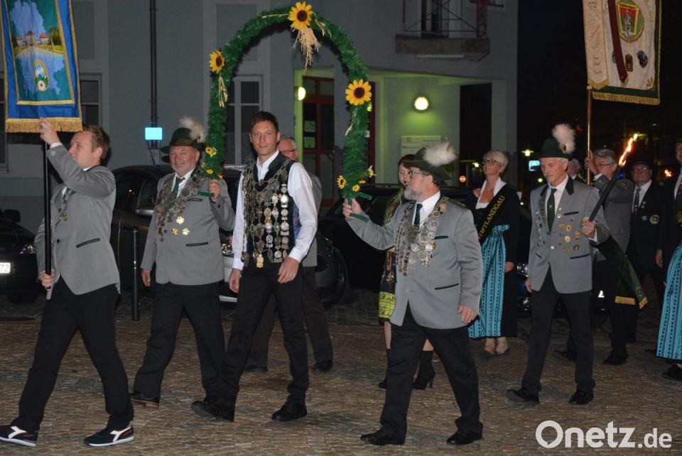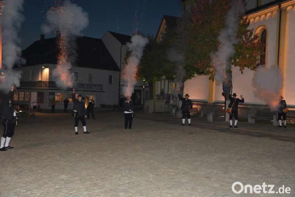 Die Glocken der Stadtpfarrkirche kündigten um 19 Uhr den Festzug an. Angeführt von der Stadtkapelle bewegten sich die mit Fackeln ausgestatteten Schützen vom Josefsheim zum alten Rathaus, wo Bürgermeister Roland Grillmeier und die Stadträte warteten. Die Böllertruppe der Mitterteicher Schützen feuerte Salven zu Ehren von Matthias Wiendl ab, außerdem spielte die Stadtkapelle auf. Der Landesschützenkönig, der voller Stolz seine Kette trug, staunte nicht schlecht angesichts des abendlichen Spektakels - und mit ihm auch zahlreiche Passanten.
