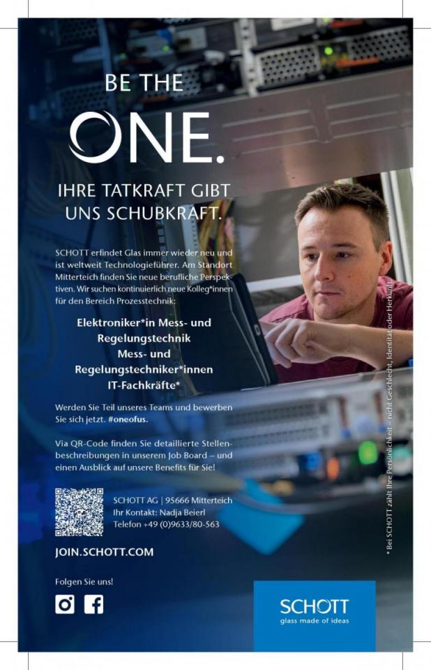 „Das wirklich Interessante ist das Spektrum der Möglichkeiten hier“, resümiert Markus Scharnagl, Abteilungsleiter Mess- und Regelungstechnik. „Wir designen selbst, haben Elektroniker und Anlagenbauer für die Hardware und ein großes Team an IT'lern für die Software.“ Durch die vielen verschiedenen Produkte und Produktionsschritte auf dem 30 Hektar großen Werksgelände sei der Job stets super abwechslungsreich, meint Scharnagl. „Und wenn man in 20 Jahren wieder in eine der riesigen Produktionshalle geht, wird da wohl niemand einen so tiefen Fußabdruck hinterlassen haben wie unser Bereich. Was wir hier bei SCHOTT machen, ist wirklich relevant.“