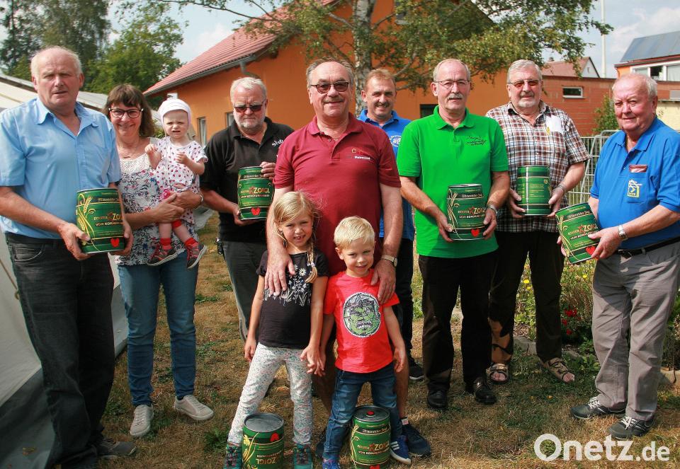 Am Ziel in Mitterteich gab es für jede Gruppe Zoiglbier. Für die teilnehmerstärkste Gemeinschaft aus Wiesau nahm Vorsitzender Reimund Frech (Mitte, mit seinen Enkeln) zwei Fässchen in Empfang. Mit im Bild Kreisvorsitzender Otmar Zeitler (Zweiter von rechts) und Mitterteichs Siedlerchef Josef Fennerl (Vierter von links).