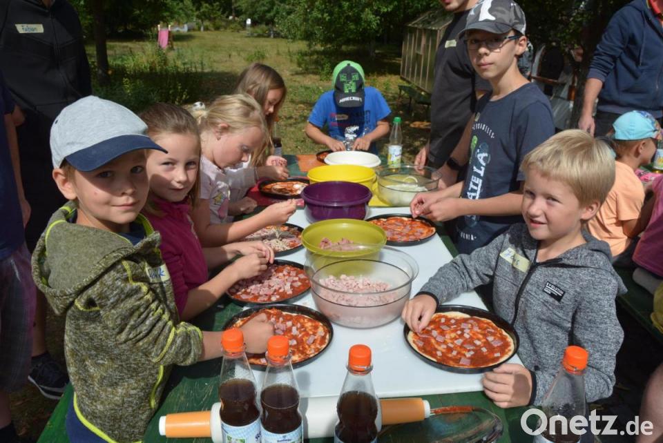 Weil der Teig bis zur weiteren Verarbeitung etwas ruhen musste, durften die Kinder die Wartezeit mit Unterhaltungsspielen verbringen. Später wurde der Teig ausgerollt und in Backformen gebracht, ehe die Kinder auf ihre Pizza Tomatensoße auftragen sowie mit dem selbst gewünschten Belag individuell belegen durften – mit Käse, Salami und Schinken. Weiter gab es noch zum Verfeinern Champignons, Zwiebeln und Paprika.