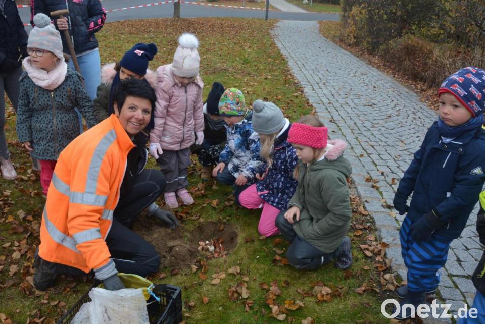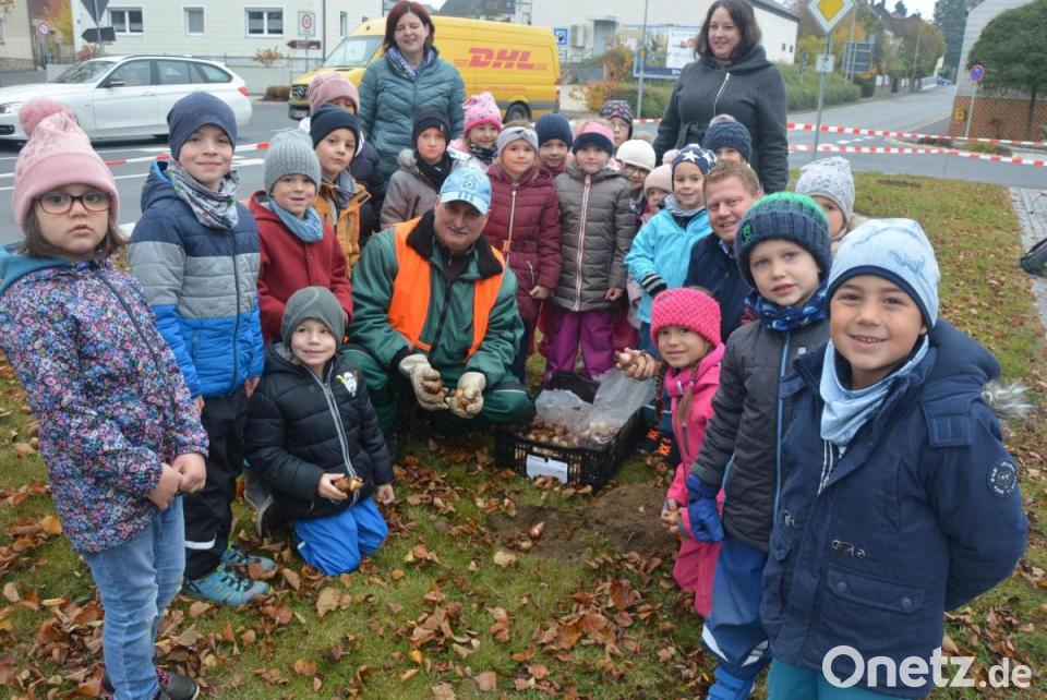 Stadtgärtner Willi Kilian und seine Mitarbeiterin Brigitte Bassek pflanzten jetzt mit 40 Vorschulkindern des Städtischen Kinderhauses „Die kleinen Hankerler“ Blumenzwiebeln beim „Wiesauer Konten“. Insgesamt will die Stadtgärtnerei 8000 Blumenzwiebeln stecken, die 2022 für ein blühendes Mitterteich sorgen sollen.
