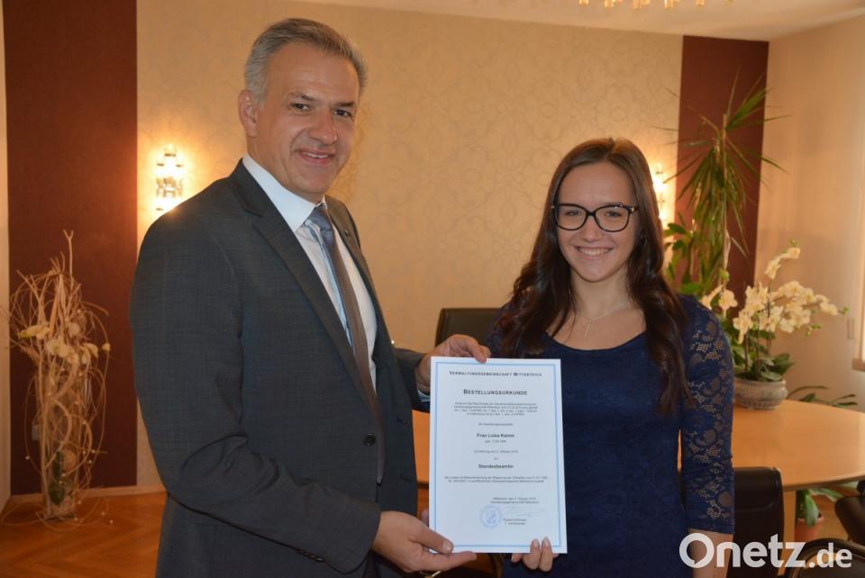 Der Rathauschef überreichte ihr die Bestellungsurkunde zur Standesbeamtin der VG Mitterteich, mit Wirkung vom 4. Oktober. Grillmeier wünschte Kamm ein glückliches Händchen bei ihrer neuen Aufgabe als Leiterin des Standesamtes.