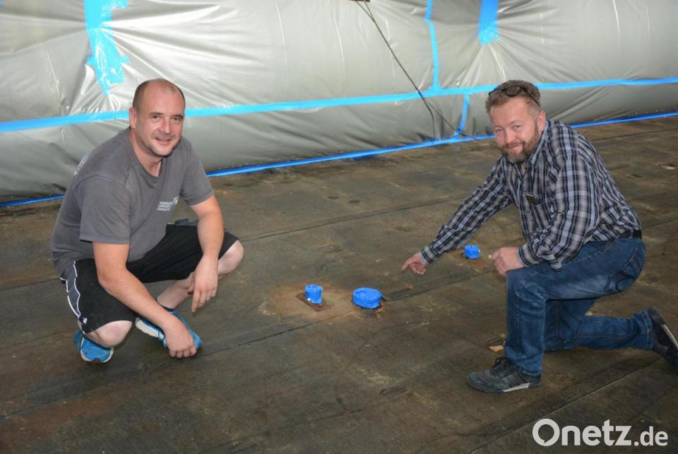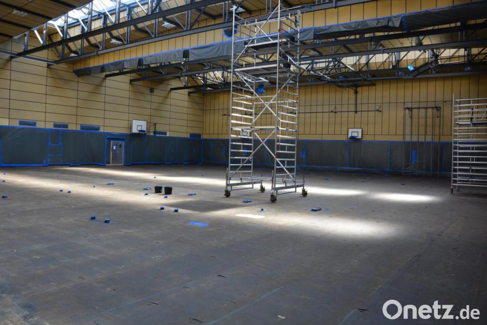 Die beauftragte Firma Firma Hornung aus Sondershausen, die mit bis zu sechs Mitarbeitern vor Ort ist, hat zunächst den alten Sportboden ausgebaut. Nun werden Kaltklebebahnen gegen Feuchtigkeit eingebracht, darauf kommt eine Ausgleichsschüttung. Anschließend wird der neue Sportboden eingebaut. Deinzer sprach von einem aufwendigen Verfahren, das hier zur Umsetzung komme. Die vorhandenen Bodenhülsen zum Aufstellen der Sportgeräte blieben erhalten, so Deinzer weiter. Vor dem Start der Ausbauarbeiten wurden die Innenwände der Halle mit Folien abgeklebt. Gereinigt wird derzeit auch die Dachkonstruktion.