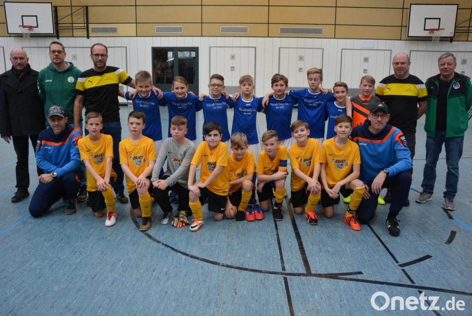 Im Finale der F-Junioren siegte der FC Tirschenreuth (stehend) im Siebenmeterschießen gegen den ASV Waldsassen (hockend). Mit im Bild (von links) Stadtverbandsvorsitzender Peter Haibach und Turnierleiter Markus Rosner sowie SV-Mitterteich-Vorsitzender Roland Eckert (rechts) und die Betreuer beider Mannschaften.