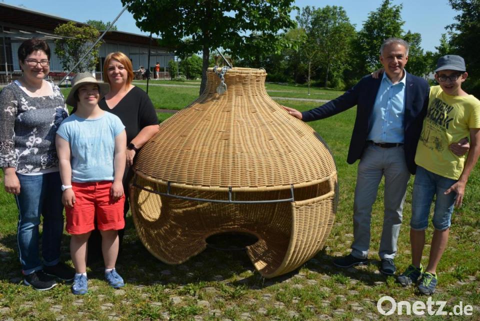 Schon seit mehr als zwanzig Jahren steht die "Weltenschaukel" des Künstlers und Spielplatzgestalters Eckart Brandau im Garten des Förderzentrums Mitterteich. Durch die rege Nutzung war es nun an der Zeit, sie wieder auf Vordermann zu bringen. Allerdings handelt sich um ein urheberrechtlich geschütztes Kunstobjekt, weshalb sich die Kosten für die Sanierung auf rund 7000 Euro beliefen. Der Elternbeirat des Förderzentrums unterstützte die Maßnahme der Lebenshilfe mit einer Spende von 1000 Euro. Darin enthalten sind auch 150 Euro von Franziska Jäger aus Konnersreuth, der die Sanierung besonders am Herzen lag. Elternbeiratsmitglied Andrea Bayerl überreichte die Spende an Lebenshilfe-Vorsitzenden Roland Grillmeier und Sandra Köstler, die Leiterin der Heilpädagogischen Tagesstätte.