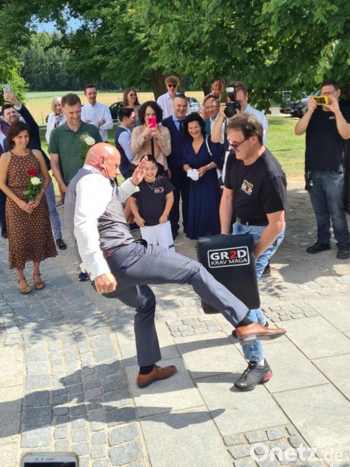 Das Schlusslied in der Kirche sang eine Freundin des Paars, dazu spielte ein Freund E-Gitarre und der Bräutigam selbst griff zur Akustikgitarre. Nach der Messe erwartete ein großes Ehrenspalier das Brautpaar. Dieses bildeten unter anderem Mitglieder der Krieger-, Soldaten- und Reservistenkameradschaft (KSRK) Mitterteich, der Reservistenkameradschaften Tirschenreuth und Falkenberg sowie Mitwirkende der Ukraine-Hilfe, bei der sich Robert Hoyer stark engagiert. Nicht fehlen durfte das Team von GR2D Krav Maga aus Wiesau, das dem Bräutigam an Ort und Stelle einige Selbstverteidigungs-Bewegungen abverlangte.
