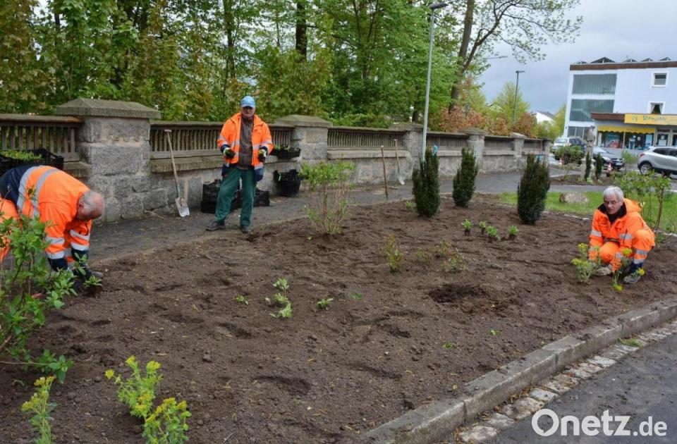 Selbst immer wieder einsetzende Regenschauer und kühle Temperaturen konnten am Dienstagvormittag die Mitarbeiter der Stadtgärtnerei nicht aufhalten. Im Umfeld der Ampelkreuzung auf der Färberbrücke und an der Wiesauer Straße setzten sie rund 420 Pflanzen in die Erde.