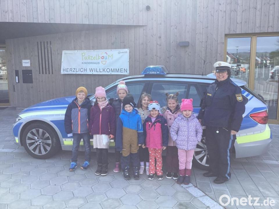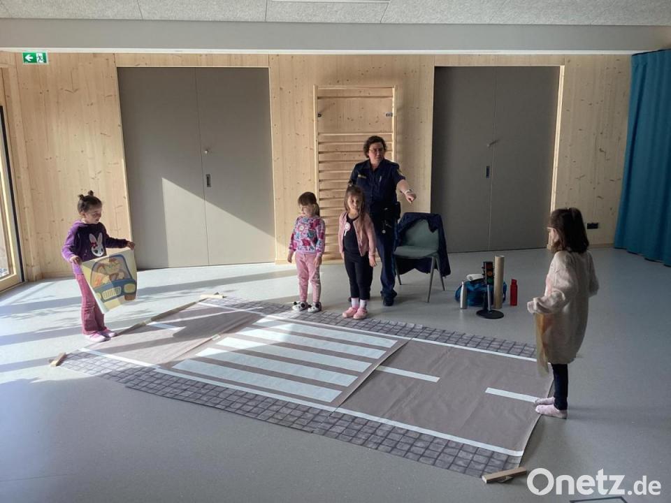 Ganz aufgeregt waren die Vorschulkinder des Kinderhauses "Purzelbaum" in Mitterteich, als kürzlich eine echte Polizistin den Kindergarten besuchte. Als erstes erfuhren die Kindergartenkinder, welche Utensilien die Polizistin immer bei sich hat. Anschließend beschäftigten sie sich mit dem richtigen Verhalten im Straßenverkehr, wofür im Kinderhaus ein großer Straßenteppich aufgebaut wurde.