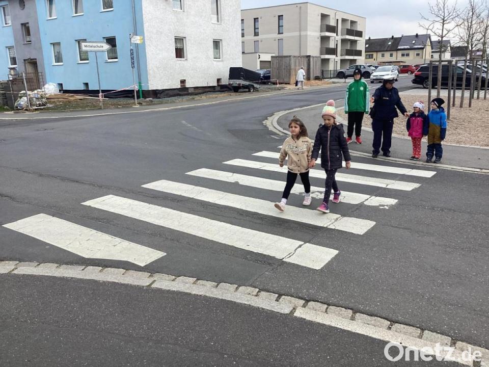 Zwei Kinder verkörperten die Autos und die restlichen Mädchen und Jungen übten, wie man sicher von der einen auf die andere Straßenseite kommt. Nachdem alle Kinder die Regeln verinnerlicht hatten, durften sie das Erlernte auch am nahe gelegenen echten Zebrastreifen ausprobieren. Am Ende des Vormittags erhielten die Kinder noch eine Urkunde, Stifte und eine Polizeimütze zum Basteln.