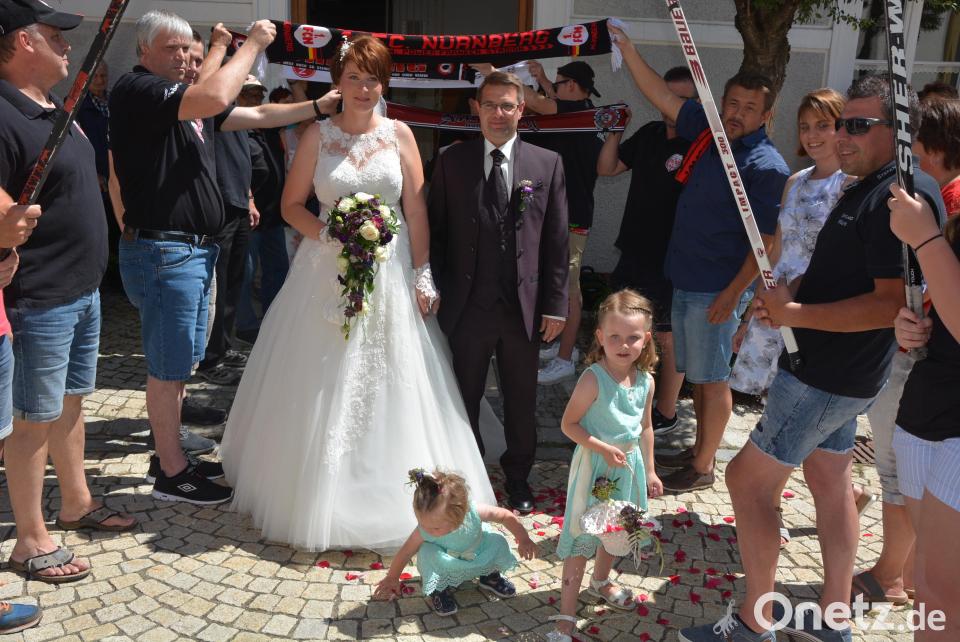 Standesbeamtin Luisa Kamm traute den Mitterteicher und die Waldsassenerin. Im Anschluss wurden die frisch Vermählten von einem riesigen Ehrenspalier erwartet. Den Auftakt machte der FCN-Fanclub Stiftland mit Vorsitzenden Harry Kutzer, es folgten die Stiftland-Wölfe - Fans des Selber Eishockeyclubs.