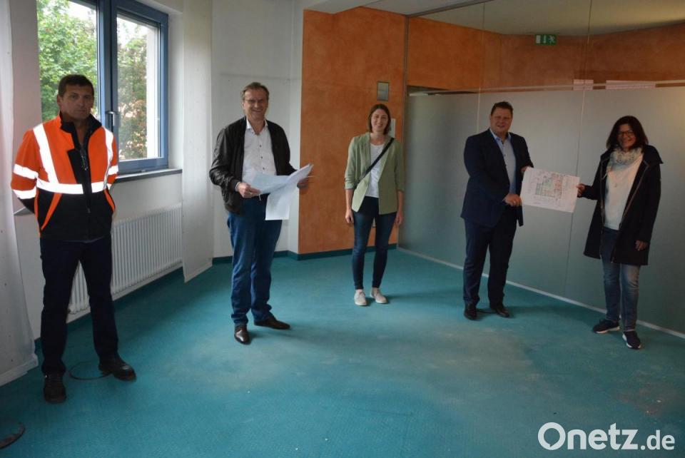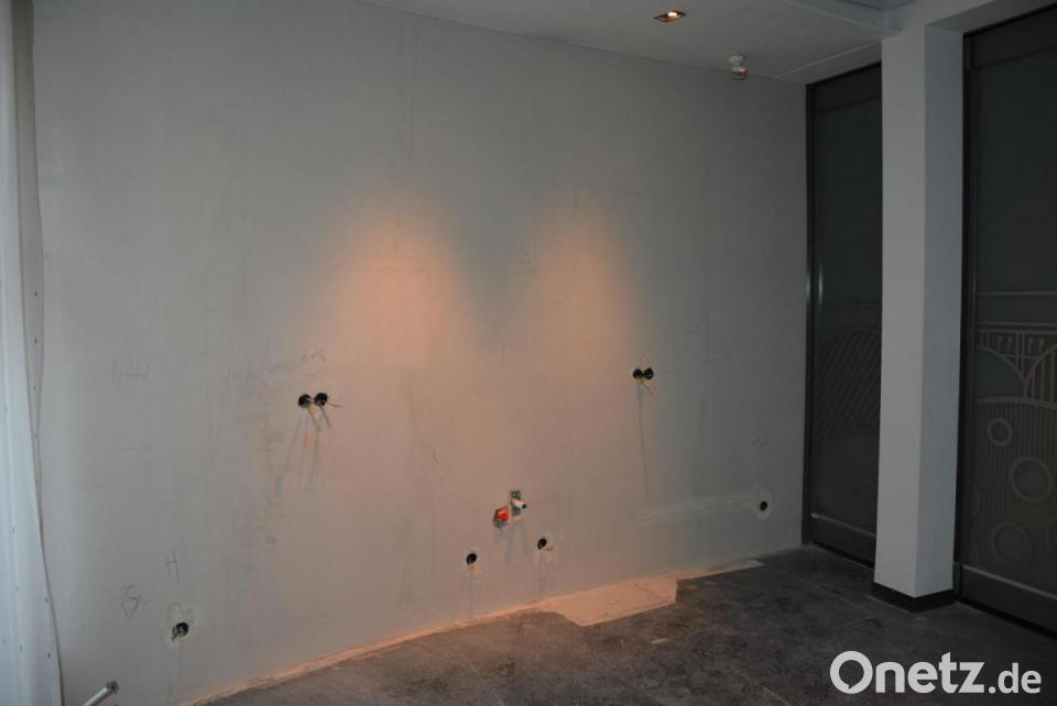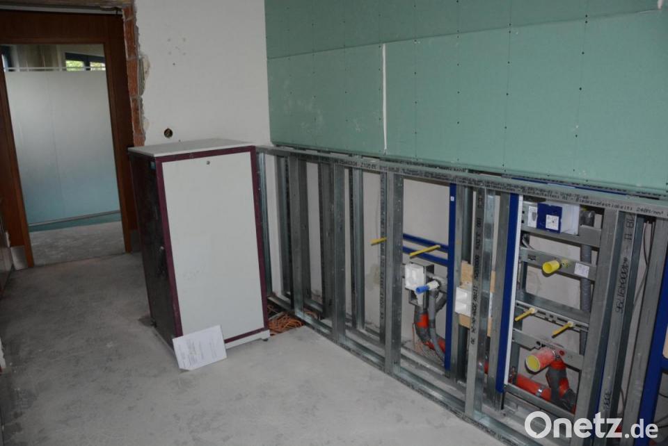 Am Mittwochvormittag besichtigten Vertreter der Stadt und der Lebenshilfe die Baustelle im ehemaligen Volksbank-Gebäude. Die Arbeiten sind schon weit fortgeschritten. Insgesamt 24 Kinder, im Alter zwischen elf Monaten und drei Jahren, finden hier eine neue Heimat. Den Verantwortlichen ist klar, dass es sich um eine Übergangslösung handelt, bis der neue Kindergarten der Lebenshilfe fertiggestellt ist. In die Räume der ehemaligen Volksbank wurden bereits Zwischenwände aus Glas eingebaut. Derzeit erfolgt der Einbau der sanitären und elektrischen Einrichtung. Danach folgen noch der Fußboden und die Beleuchtung. Weiter müssen aus jedem Gruppenraum noch Fluchtwege durch die Außenwand gebrochen werden; diese Arbeiten soll der Bauhof ausführen. Entstehen werden dann zwei Gruppenräume, ein Schlafraum, ein Essraum mit Bistro sowie ein Gruppenleiterzimmer.