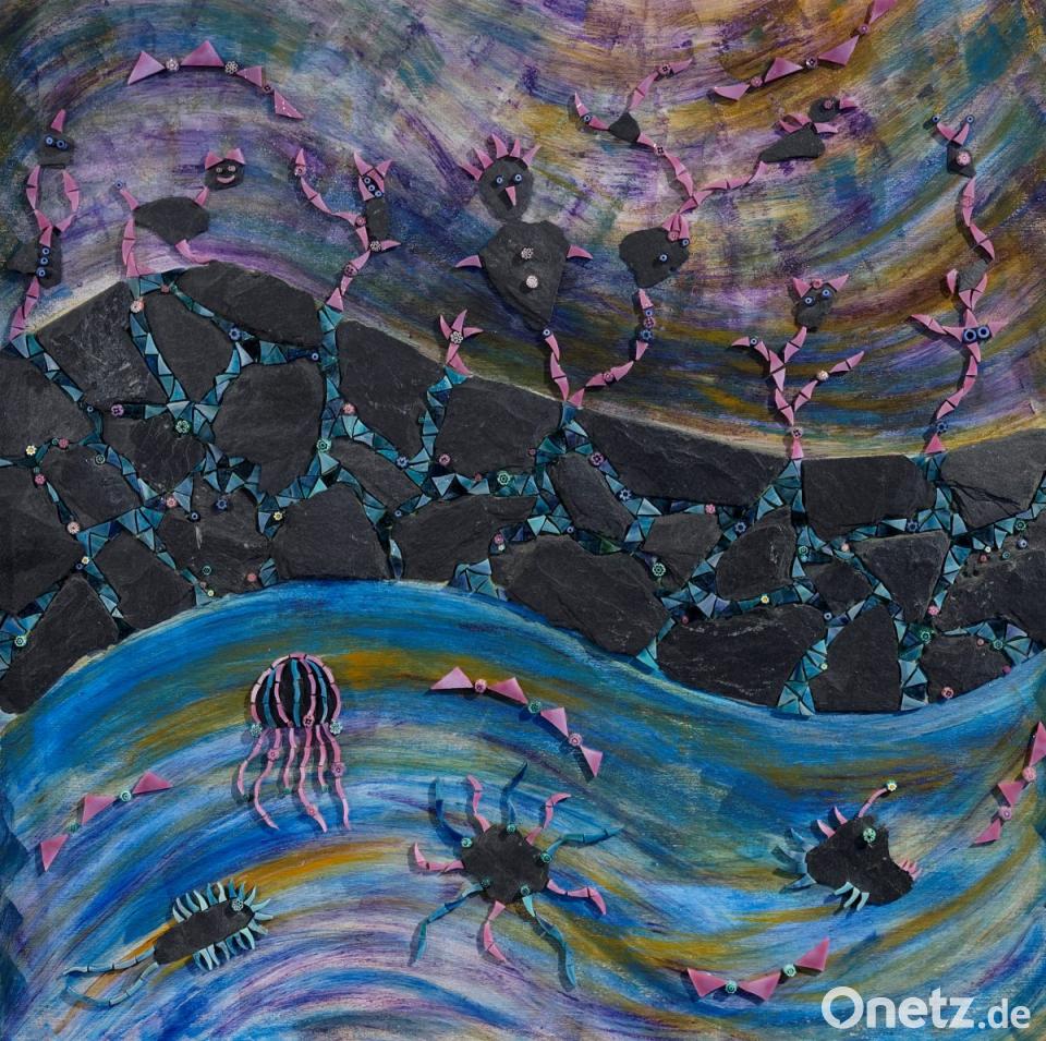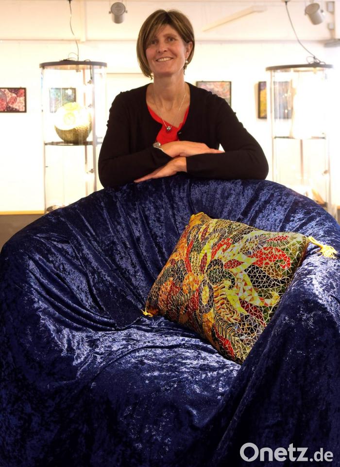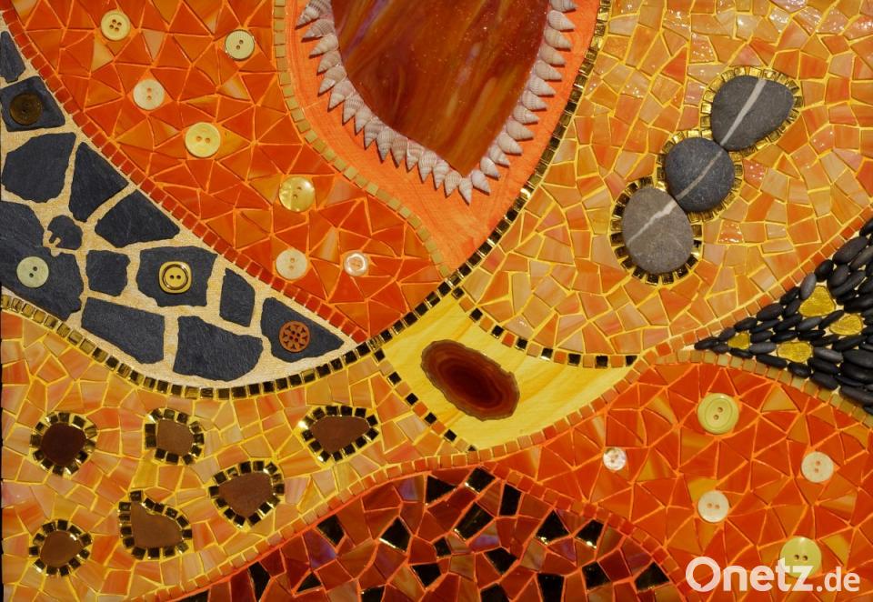 Seit Kerstin Rumswinkel in Barcelona das erste Mal mit kleinen Steinchen aus Glas in Berührung kam, ist sie fasziniert vom Mosaiken. Fünf Jahre lebte sie mit ihrer Familie in der Metropole und war dort auch Teilnehmerin bei Workshops im Mosaikatelier "Trozo x Trozo". Zurück in Deutschland, verfeinerte sie autodidaktisch diese filigrane Kunst und brachte es bis heute zum meisterhaften Können - vor allem, was die Gestaltung von Objekten betrifft. Ein Kissen mit einem gläsernen Mosaiküberzug mit Teilchen aus Glas der Sorte "Smalti Veneziani", ihrem Lieblingsmaterial, das auf einem blauen Sessel im Eingangsbereich der Ausstellung drapiert ist, unterstreicht diese Aussage. Von Tiffany-Glas der Firma "Spectrum" aus den USA, Millefioriglas aus Murano und Steinen von Swarovski über vom Meer geschliffene Glasscherben und Muscheln bis hin zu flachen Flusskieselsteinen - all das verarbeitet Kerstin Rumswinkel in ihren Werken.