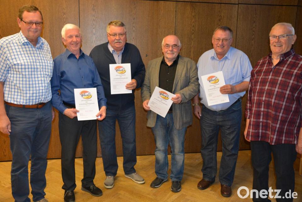 Mehrmals wurde beim Jubiläumstreffen der Schlachtruf "Vau ... duG" angestimmt - dieser erklang jeweils dreimal hintereinander. Natürlich wurde zum Jubiläum auch gut gespeist, so wie damals bei der Wirtin im Gasthof "Zum Bären". Auf den Tisch kamen Tatar, Strammer Max, Russische Eier, belegte Brote und heimisches Bier. Zubereitet wurde das Essen vom Vorsitzenden Günter Schampera und seiner Frau Heidi. Beide waren zu Gründungszeiten des Vereins im Gasthof "Zum Bären" beschäftigt. Geehrt wurden abschließend die vier anwesenden Gründungsmitglieder Alfred Hecht, Karl-Heinz Ernstberger, Manfred Bäcker und Ernst Bayer. Nach dem offiziellen Teil folgte das Feiern in gemütlicher Runde, so wie es der VduG von Anfang an gepflegt hat.