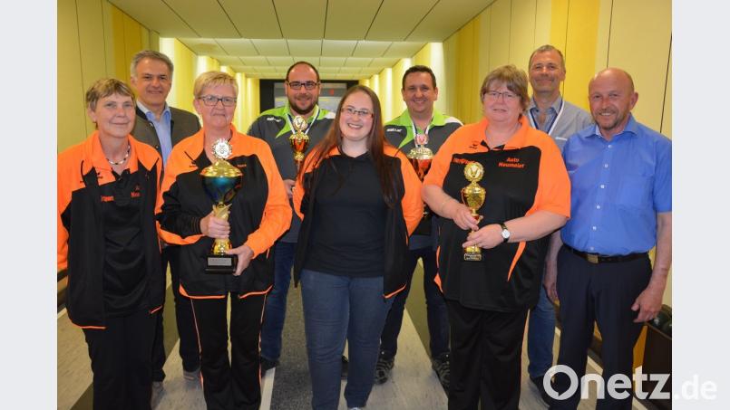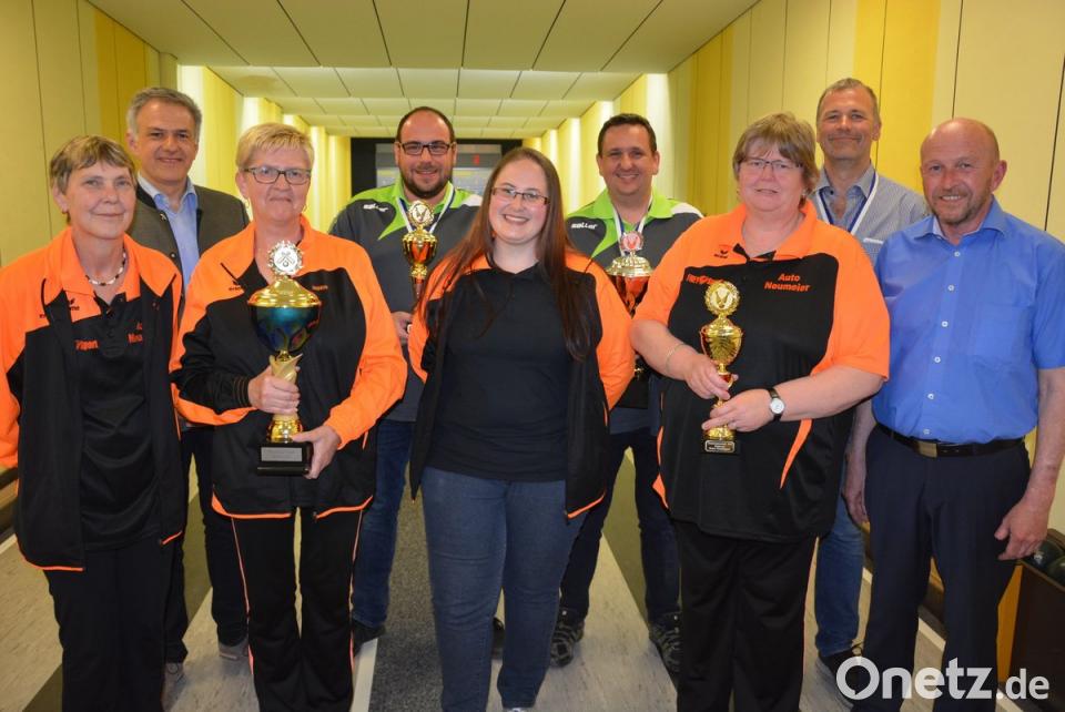 Die erwarteten Favoritensiege gab es beim Stadtpokal-Wettkampf der Kegel-Mannschaften. Bei den Damen landete der KC Mitterteich mit 1710 Holz vor "Gut Holz" (1640 Holz) und dem SV (1570 Holz). Bei den Herren dominierte der SV mit 1748 Holz, dahinter folgten der KC (1640 Holz) und "Gut Holz" (1606 Holz). Im Bild (von links) Sabine Ibsch, Bürgermeister Roland Grillmeier, Ingrid Müller, Sebastian Meyer, Christina Stöckl, Tobias Kerst, Dagmar Skrobatz, Markus Riedl und Sportstadtverbandsvorsitzender Peter Haibach. Bild: jr