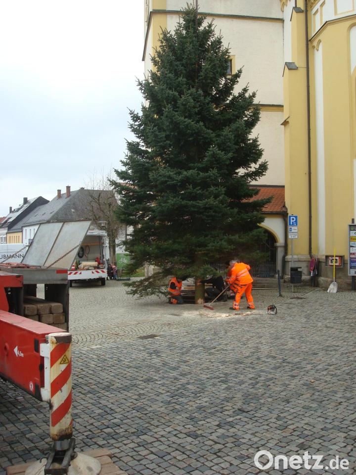 Fünf städtische Arbeiter waren nötig, um das tonnenschwere Stück unversehrt aufladen zu können. Unversehrt wurde der Baum zum Kirchplatz transportiert und dort wieder mit Hilfe des Krans vorsichtig aufgestellt. Lediglich der Stamm musste für die Vertiefung noch etwas angepasst werden, um das große Stück sicher zu verankern. Nach etwa zwei Stunden waren die Arbeiten erledigt.