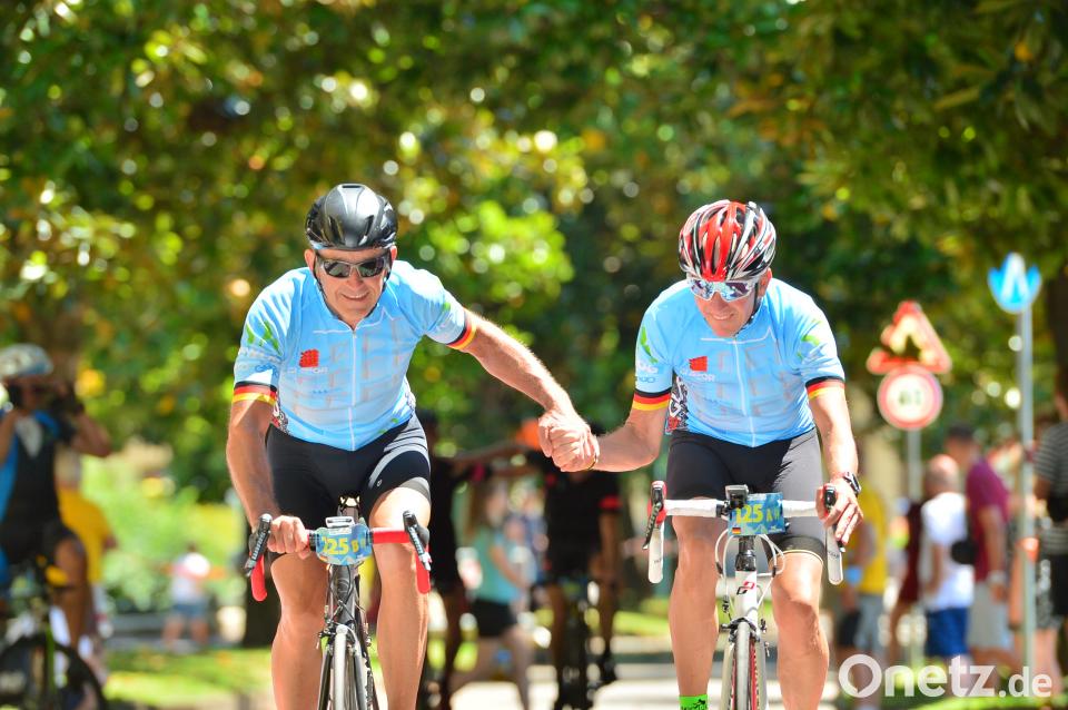 Unter rund 85 Teilnehmern in der Altersklasse über 50 kam das Duo als 22. ins Ziel. Dass sie als "Team Nu amal" an den Start gingen, hat eine Vorgeschichte: Beide bereiteten sich schon vor zwei Jahren auf das Radsportereignis vor. Doch Büsching musste kurzfristig absagen: Ihn hatte die Grippe erwischt. "Und wenn du krank bist, brauchst du dort nicht mitfahren", so Büsching im Rückblick. Frank dagegen zog 2016 das Ding durch - mit einem anderen Partner, der kurzfristig einsprang. Doch er versprach seinem Sportsfreund Büsching: Wir treten zu gegebener Zeit an - noch einmal, auf oberpfälzisch "nu amal" eben. Anders als vor zwei Jahren, als sich die beiden Manager einen Coach nahmen, bereiteten sich Büsching und Frank diesmal nicht besonders auf die Aktion vor. "Wir haben das Pensum nicht groß geändert", erinnert sich Büsching an die regelmäßigen Trainingseinheiten im Vorfeld.