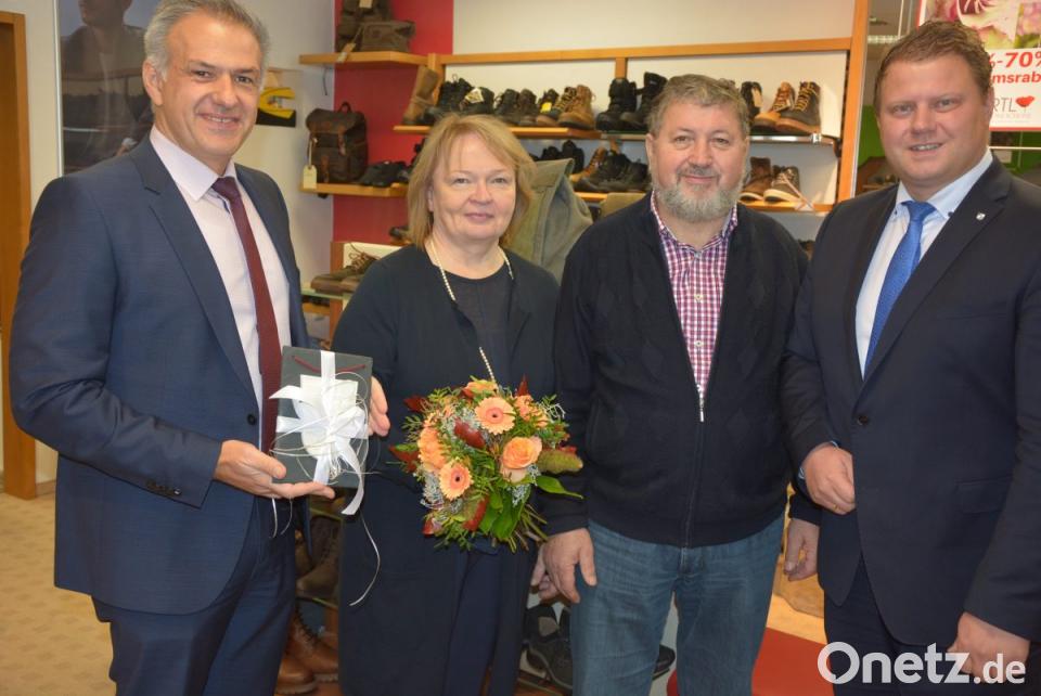 Grund zum Feiern hat das Schuhhaus Mörtl: Seit 70 Jahren existiert der familiengeführte Betrieb, zudem können Christine Mörtl-Wurdack und Ehemann Josef Wurdack das 30-jährige Geschäftsführer-Jubiläum begehen. „Wir sind glücklich über solche Geschäfte mitten in der Stadt. Und stolz, dass es Familien gibt, die diese Tradition fortführen“, sagte Bürgermeister Roland Grillmeier. „Solche Geschäfte sind es, die eine Kleinstadt ausmachen“, ergänzte der Bürgermeister und überreichte ein Porzellan-Stadtwappen auf Schiefer. Für den Gewerbeförderverein gratulierte Vorsitzender Stefan Grillmeier, der von einem starken Verbund der Mitterteicher Geschäfte in der Innenstadt sprach. Bei dieser Gelegenheit kündigte er an, dass es im kommenden Jahr wieder eine Veranstaltung mit dem Titel „Sommer in der Stadt“ geben werde. Eventuell können die Geschäfte in der Innenstadt mit eingebunden werden, dazu werde es Gespräche geben.