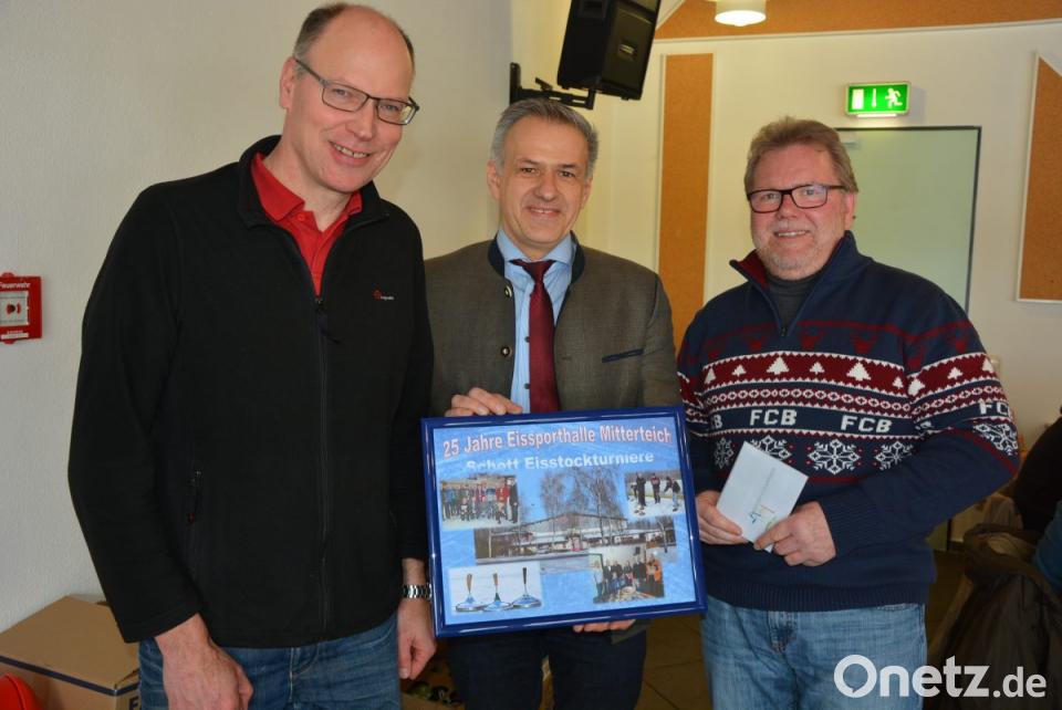 Seit 25 Jahren gibt es die Mitterteicher Eissporthalle - und von Beginn an finden dort regelmäßig Eisstockturniere der Schott AG statt. Zuvor waren die Wettbewerbe auf Natureis über die Bühne gegangen, so dass jetzt bereits das 47. Schott-Turnier auf dem Programm stand. Das Eishallen-Jubiläum nahm Bürgermeister Roland Grillmeier zum Anlass, um Standortleiter Stefan Rosner und Betriebsrat Gerhard Greim mit einer Collage für die Treue zur Einrichtung zu danken. Die Beliebtheit der Eishalle zeigte sich an den Besucherzahlen, mehr als 2000 Leute an den Wochenenden seien keine Seltenheit. Freilich sei der Unterhalt nicht leicht zu stemmen, umso mehr bedürfe es großer Unterstützer und Förderer. Der Bürgermeister wünschte sich, dass Schott der Eishalle auch künftig treu bleibt.
