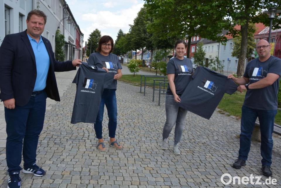 Robert Hoyer und Natalie Wölfl von der BRK-Bereitschaft, Martina Rüth von der Stadtverwaltung und Bürgermeister Stefan Grillmeier stellten am Dienstag eine T-Shirt-Aktion unter dem Motto "#mitterteichhältzam" vor. Erhältlich sind dunkelgraue Hemden, die neben diesem Spruch auch das Logo der Stadt und die Stadtfarben Schwarz, Weiß und Blau zeigen.