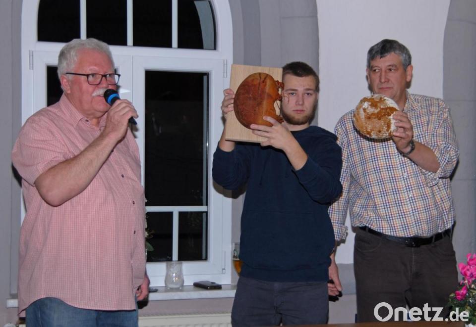 „Zum Ersten, zum Zweiten und zum Dritten“, war dann immer wieder die Ansprache des Auktionators, mit der er die Ware an den Mann brachte. Die hausgemachten Presssäcke von Hans Jürgen Schindler waren bei den Bietern sehr beliebt und brachten jeweils meist über 20 Euro für die Vereinskasse ein. Einige davon „überlebten“ den Abend nicht, denn sie wurden gleich am Tisch zum Kosten aufgeschnitten. Der hervorragende Geschmack und der Duft der geräucherten Spezialität regte wieder andere Besucher an, auch so einen Preis zu ergattern.