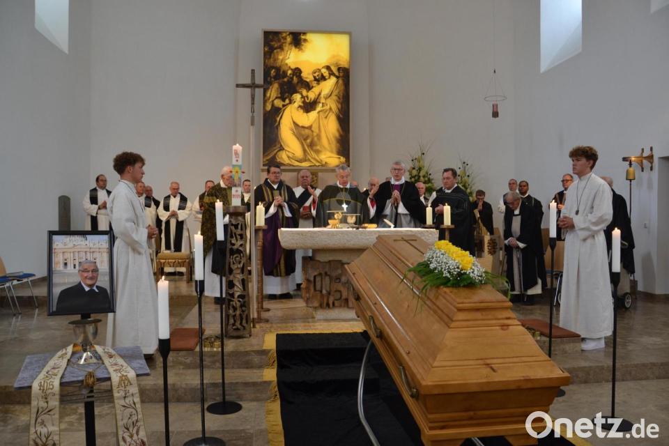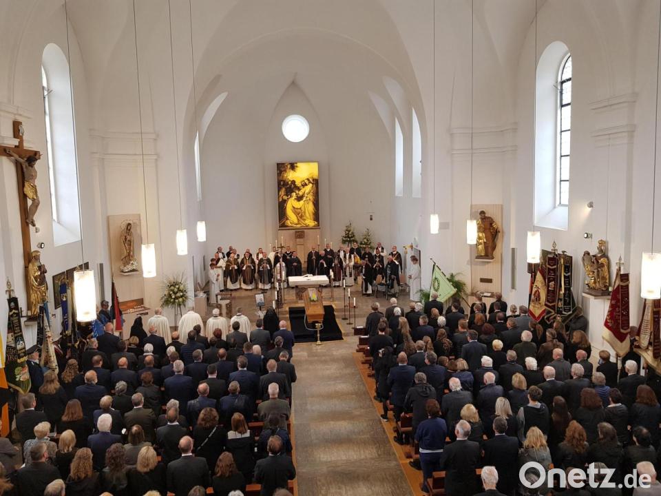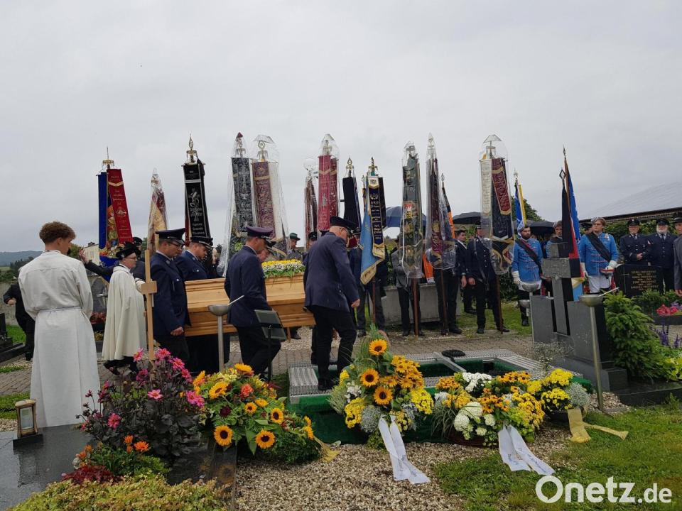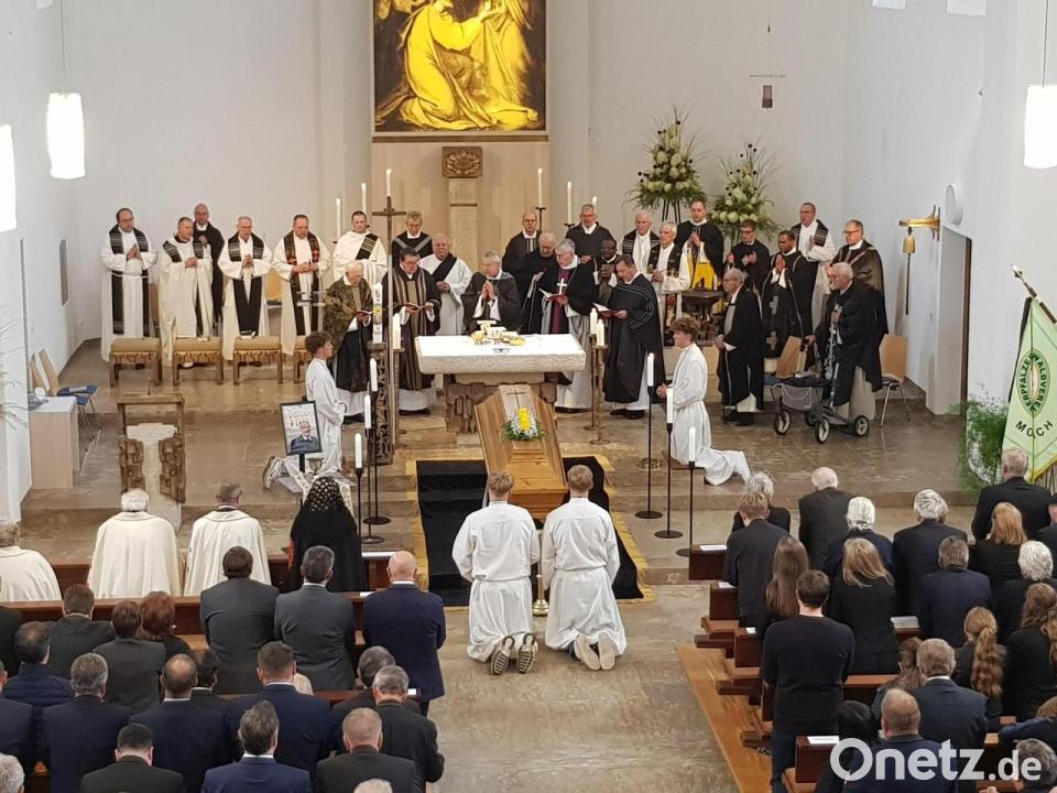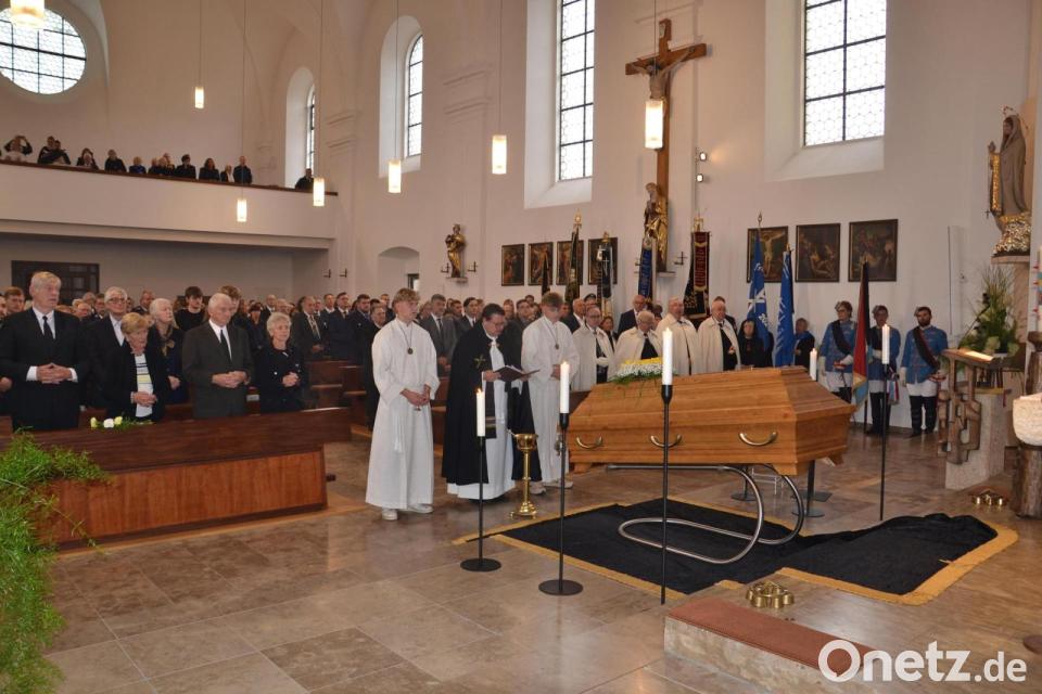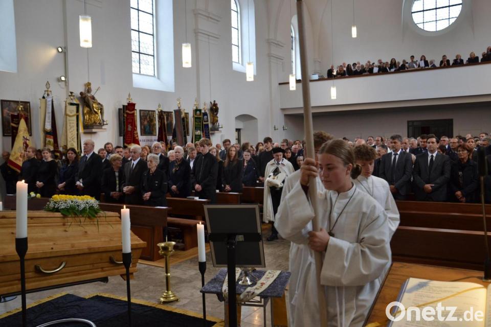 Sein einziger noch lebender Bruder Josef mit seiner Frau Sieglinde und allen Angehörigen und Verwandten hatten sich eingefunden. Dazu kamen weitere Ehrengäste, Vereine, kirchliche und weltliche Vertreter sowie Gäste aus Friesen und Bamberg und die Bevölkerung. Die Pfarrkirche war überfüllt. Zwanzig Fahnenabordnungen standen an den Seiten. Die Kirchenchöre aus Moosbach und Tröbes, begleitet von Ludwig Putzer an der Orgel, stimmten mit "Meine Zeit" in die Trauerfeier ein. Solosängerin Jenny Hofmeister sang "Nimm mich in deine Arme o Herr" und "Mögen Engel dich begleiten".