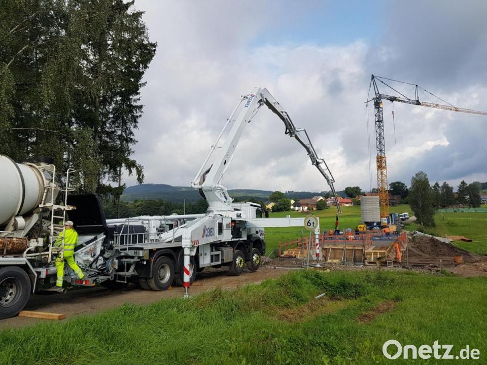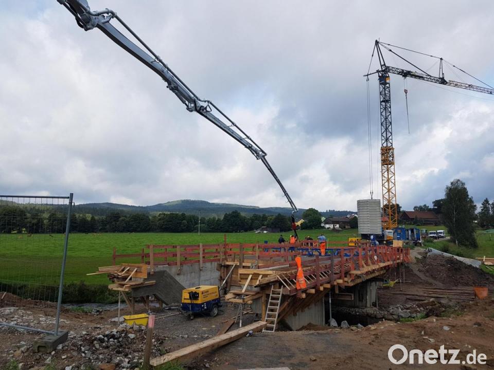 Nach dem Abbruch der alten, rund 80-jährigen Brücke über den Pfreimdfluss zwischen Lohma und Heumaden im Juni ist ihr Wiederaufbau inzwischen schon weit fortgeschritten. Die Baufirma Fahrner aus Mallersdorf-Pfaffenberg hat bereits mit der Betonierung des Überbaus begonnen. Hierzu waren rund 90 Kubikmeter hochwertiger Beton der Klasse C 35/45 aus dem Betonwerk Vohenstrauß erforderlich.