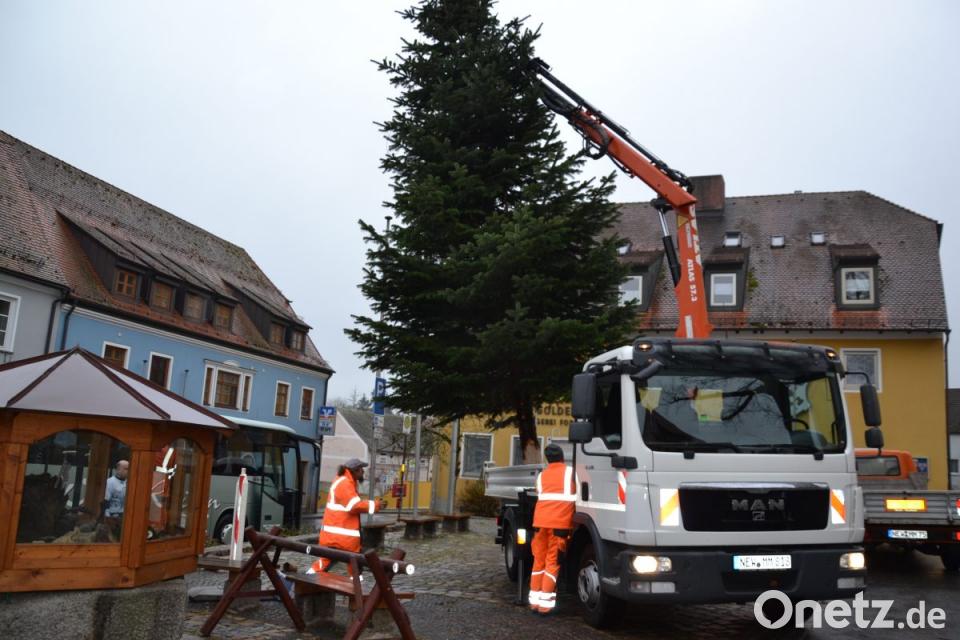 Die Bediensteten des Bauhofs, Arnold Stahl und Christian Scherer, haben den Baum vom Tannenhof Bösl aus Eslarn geholt. Mit dem Kran auf dem Lastwagen wurde die schöne Nordmanntanne aufgeladen und nach Moosbach transportiert. Zuvor wurde der Stamm noch bearbeitet und am oberen Teil die erste Lichterkette angebracht. Mit dem Autokran wurde dann der Baum in den vorbereiteten Schacht am Marktplatz in die Senkrechte gestellt und verankert. Mit weiteren acht Lichterketten wurde der Baum noch geschmückt. Während der Advents- und Weihnachtszeit wird der Christbaum am Marktplatz leuchten. Daneben hat der Frauenbund die Brunnenkrippe auf dem Marktbrunnen aufgestellt. Die besonders wieder von den Kindern bestaunt sein wird.