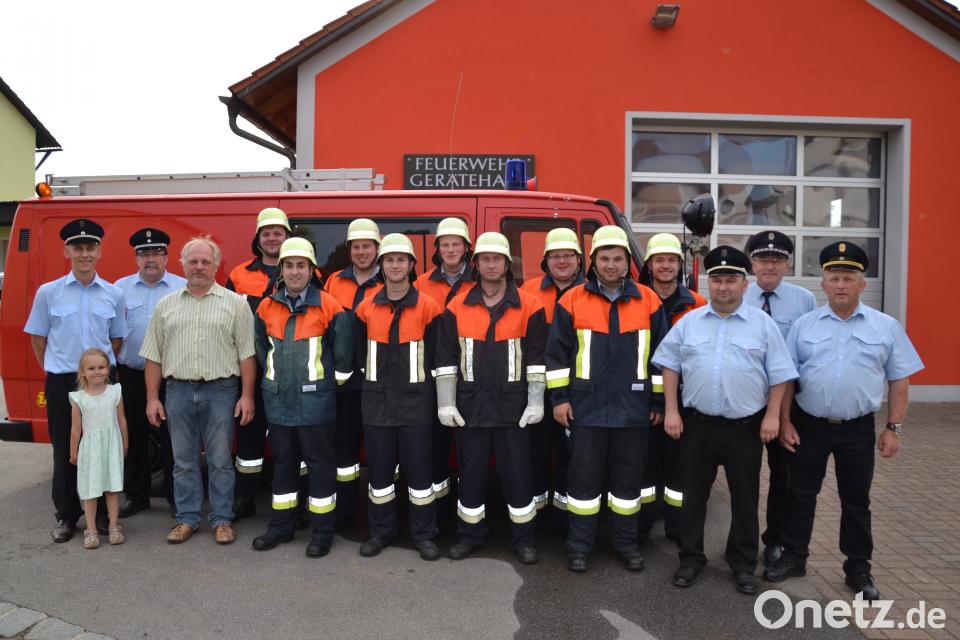 Die neue Löschgruppe der Feuerwehr Heumaden nach bestandener Prüfung der Leistungsstufen 2, 3, 4 und 6. Kreisbrandinspektor Martin Weig, Vorsitzender Michael Bauer und zweiter Kommandant Hans-Peter Müller (von rechts) sowie Kommandant Johannes Hoch, Kreisbrandmeister Thomas Kleber und zweiter Bürgermeister Fritz Steinhilber (von links) gratulierten.