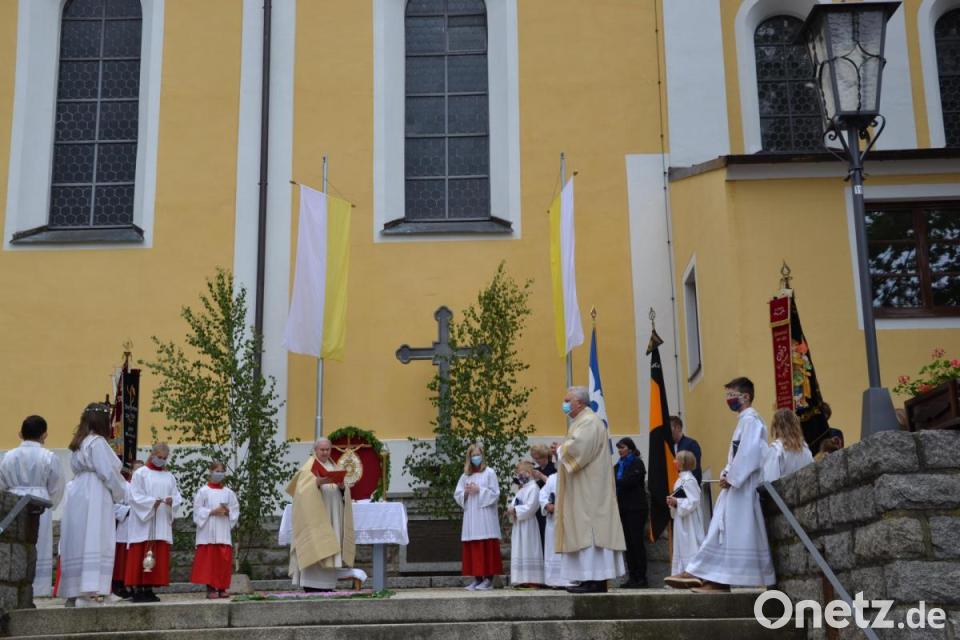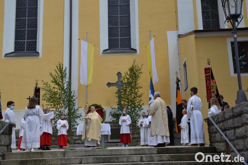Nach dem Gottesdienst wurde das ausgesetzte Allerheiligste vom Priester zum aufgebauten Altar am Südportal zum Marktplatz getragen. Dort standen bereits Fahnenabordnungen und die Kommunionkinder im entsprechenden Abstand, denn der Gottesdienst wurde ebenfalls nach draußen übertragen. Auch die Gläubigen standen am Marktplatz. Mit eingebunden waren alle in dieser Coronakrise Leidenden, die Kranken und alle Helfenden. Die Böllerschützen feuerten drei Mal ab.