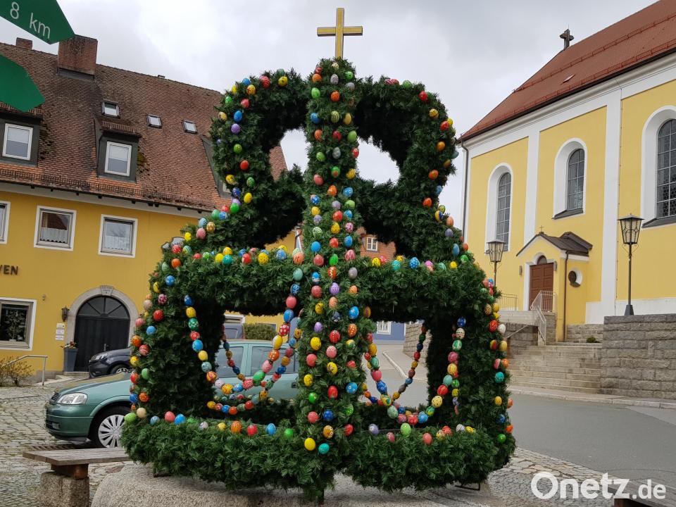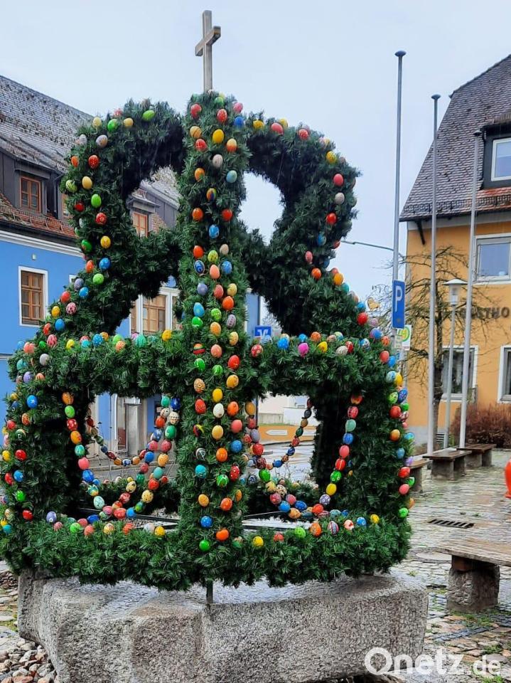 Der Osterbrunnen ist in diesem Jahr wieder ein Schmuckstück am Marktplatz. Vier Frauen des Katholischen Frauenbundes mit Vorsitzender Angela Striegl haben die Osterkrone in der Halle am Bauhof der Gemeinde geflochten. Da es jedes Jahr schwieriger wird, Tannenstreu zu bekommen, hat man entschieden, diesmal mit künstlicher Streu zu flechten. In aufwendiger Kleinarbeit wurde die Krone gebunden und mit bunten Eiern auf Stäben oder aufgereiht auf Ketten bestückt. Mehr als 900 ausgeblasene und handbemalte Hühnereier, jedes Ei ein Unikat, zieren die Osterkrone.