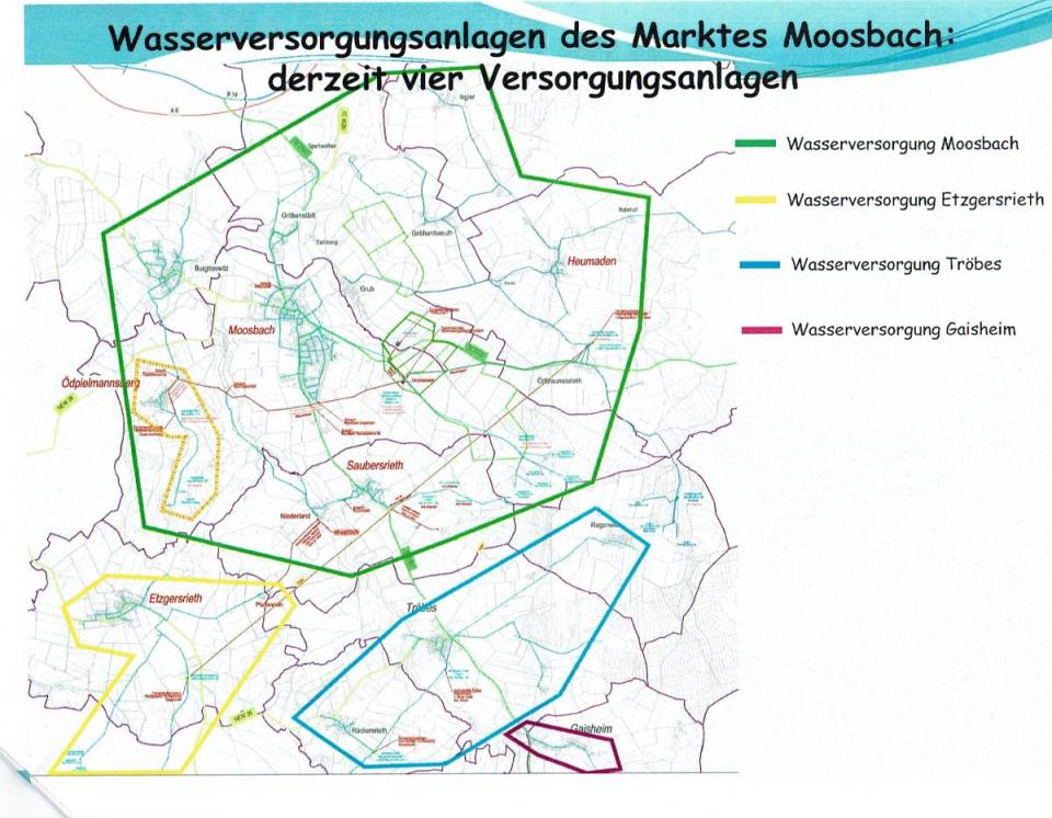 Es gäbe auch kostengünstigere Lösungen, etwa durch den Zusammenschluss der vier Versorgungsanlagen zu einer Einrichtung. Ortsteilversallmungen in Etzgersrieth, Tröbes und Gaisheim haben ergeben, dass viele Bürger gegen einen oslchen Zusammenschluss sind. Es wurde auch klar, dass Moosbach unter Umständen die Sanierung mitfinanzieren müsste.